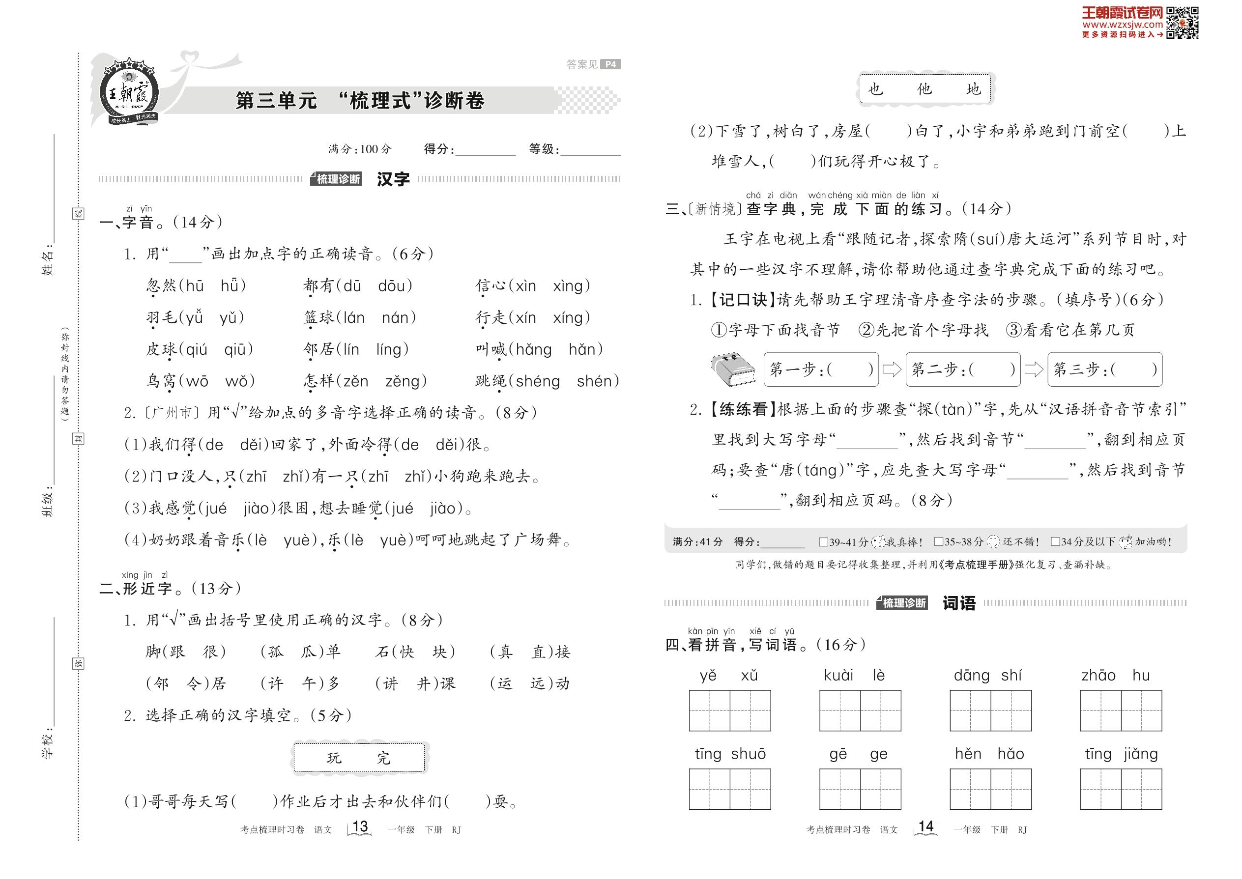 2023下册一年级语文人教版 第三单元 “梳理式”诊断卷
