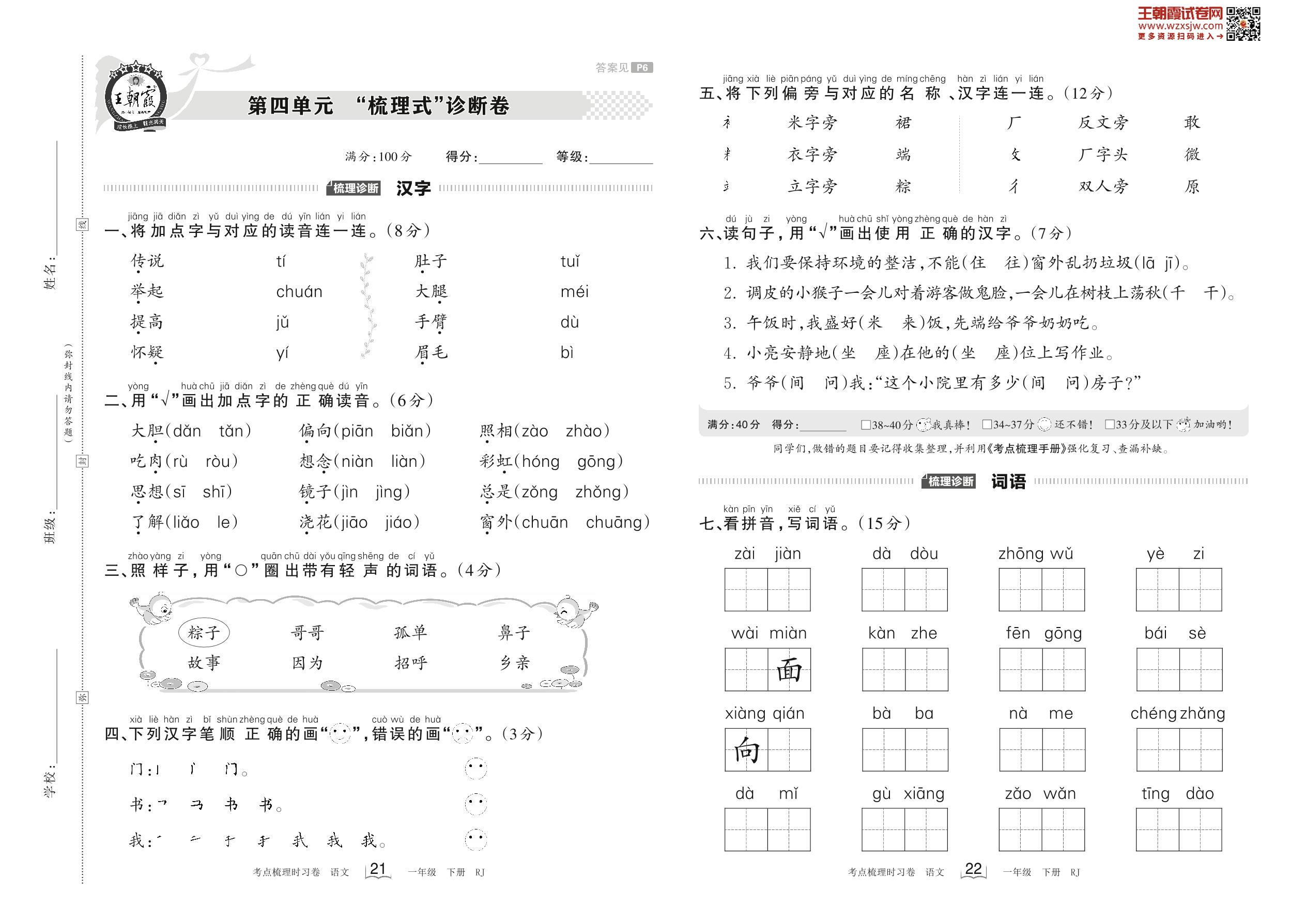 2023下册一年级语文人教版 第四单元 “梳理式”诊断卷