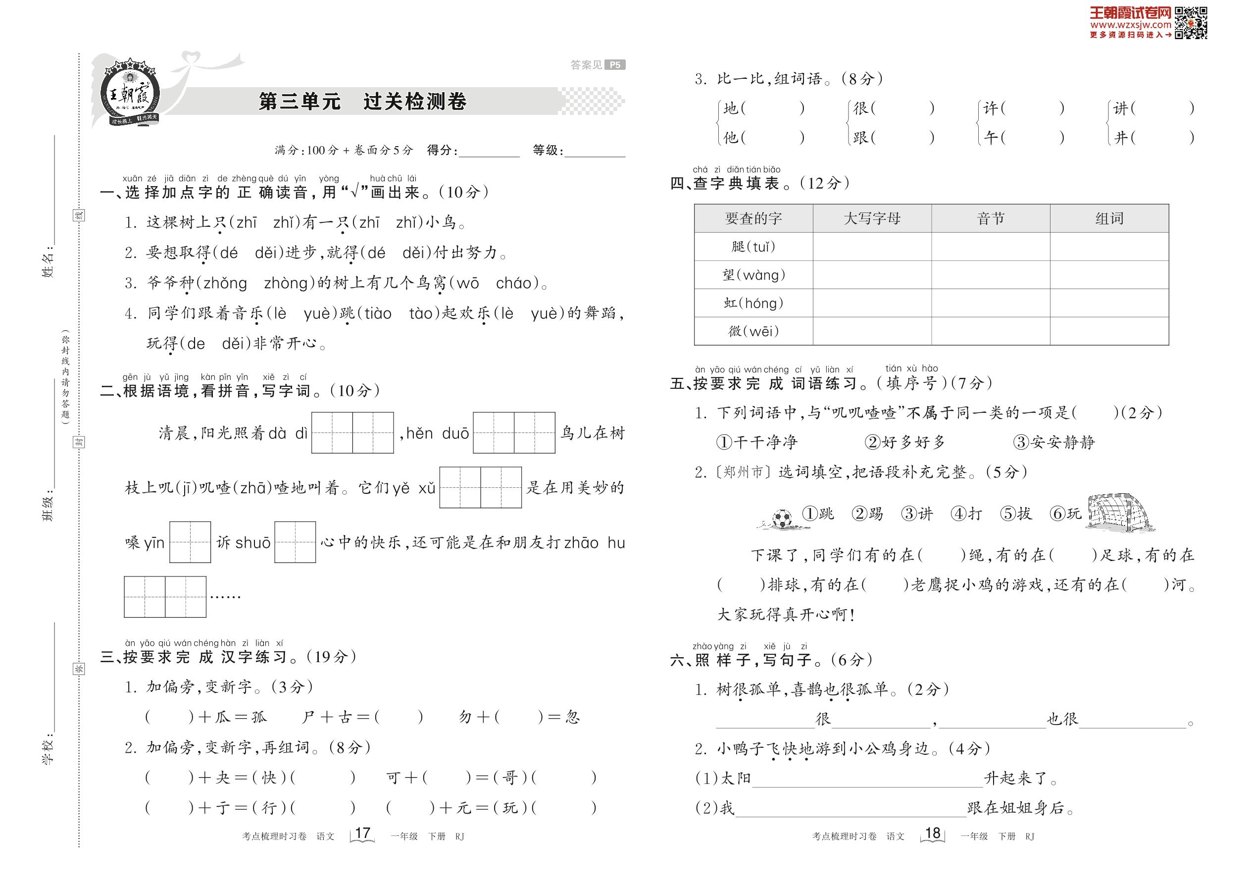 2023下册一年级语文人教版 第三单元 过关检测卷
