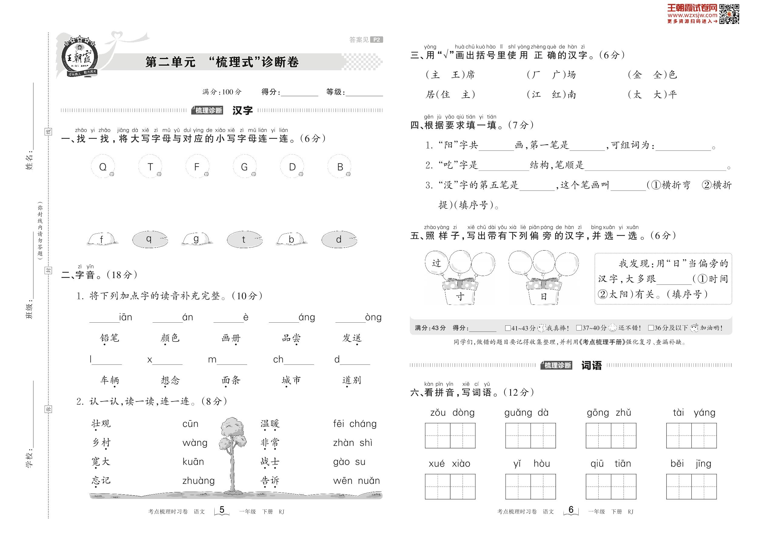 2023下册一年级语文人教版 第二单元 “梳理式”诊断卷