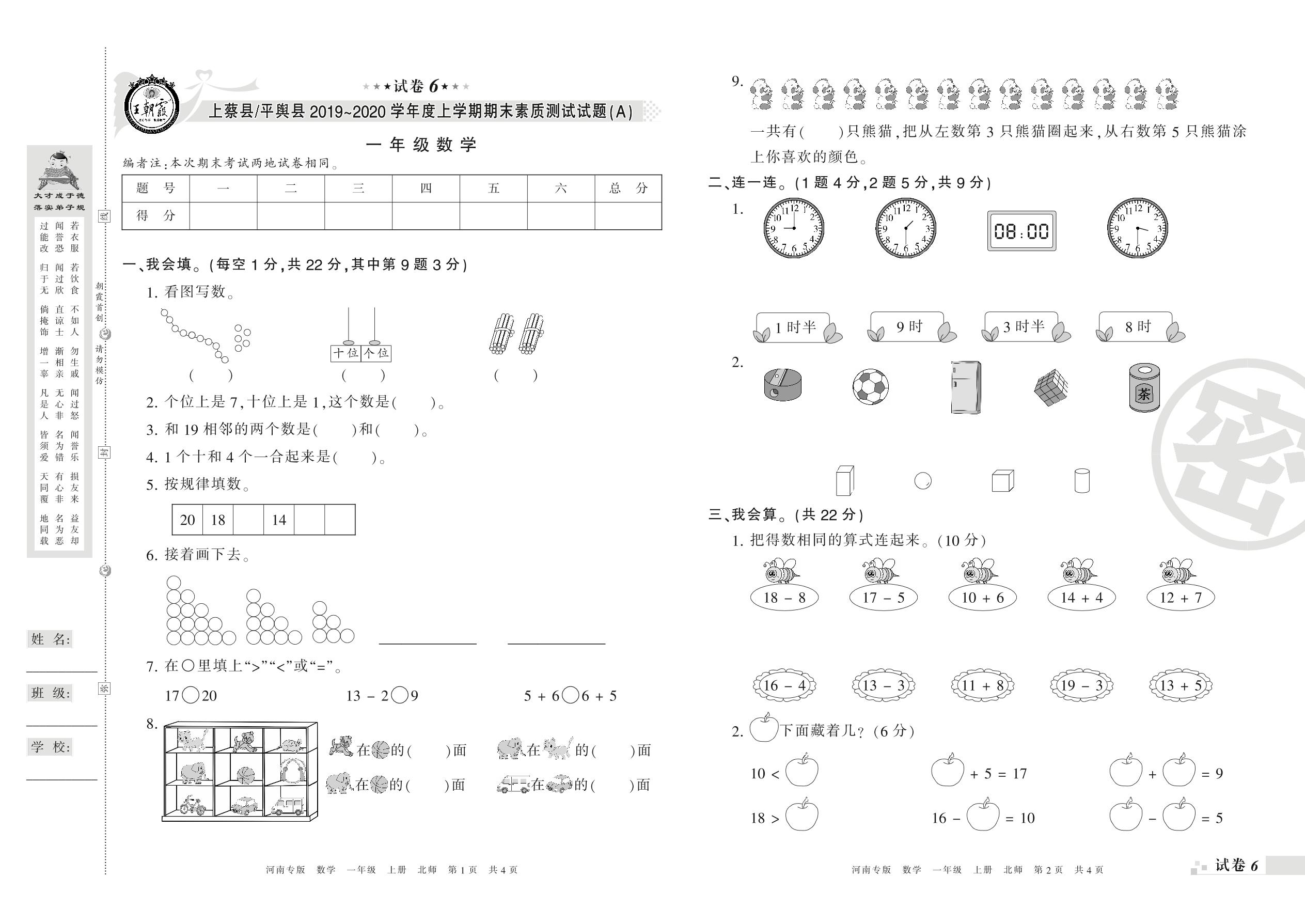 2019-2020学年第一学期驻马店市上蔡县、平舆县一年级数学试卷(北师版)【6】