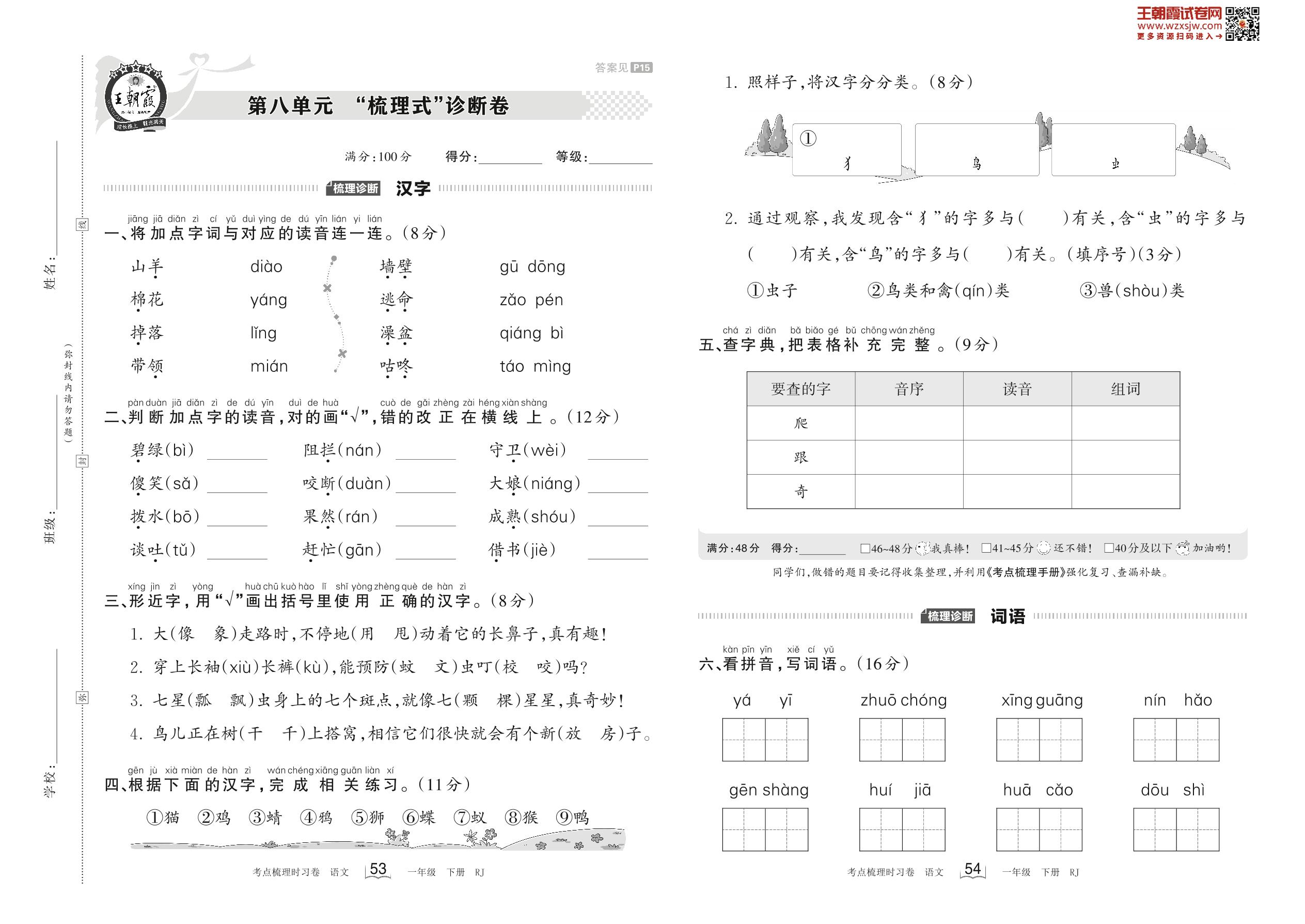 2023下册一年级语文人教版 第八单元 “梳理式”诊断卷