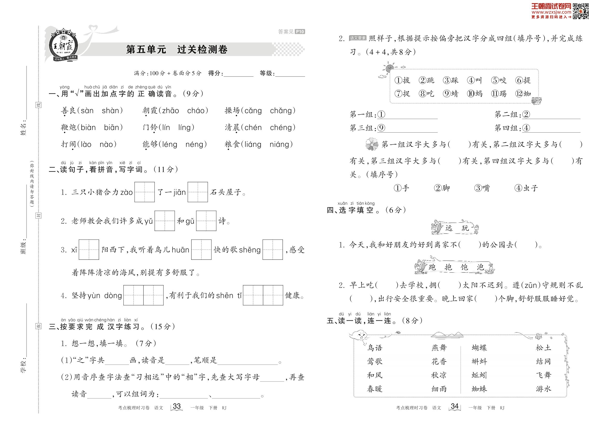 2023下册一年级语文人教版 第五单元 过关检测卷