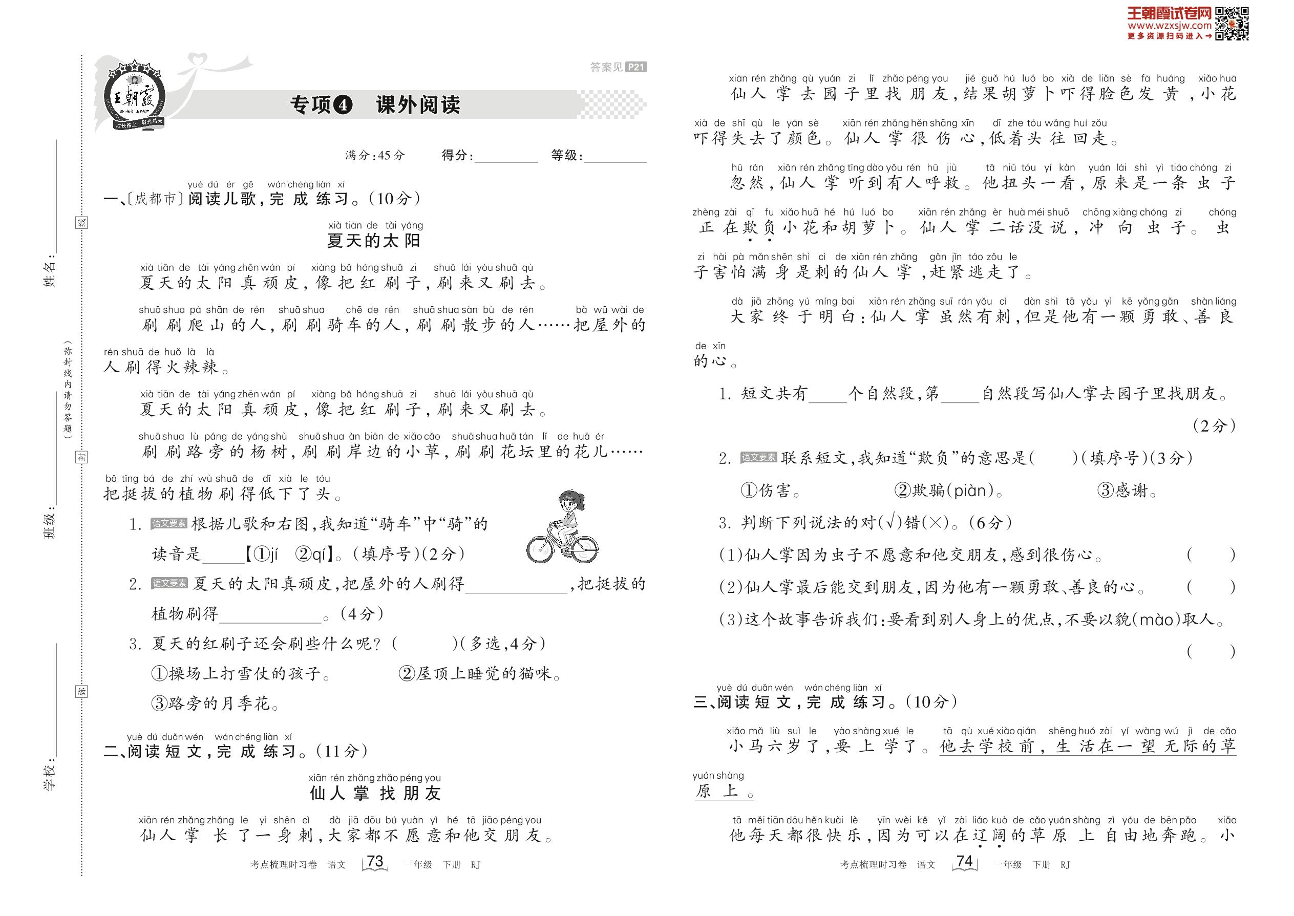 2023下册一年级语文人教版 专项4 课外阅读