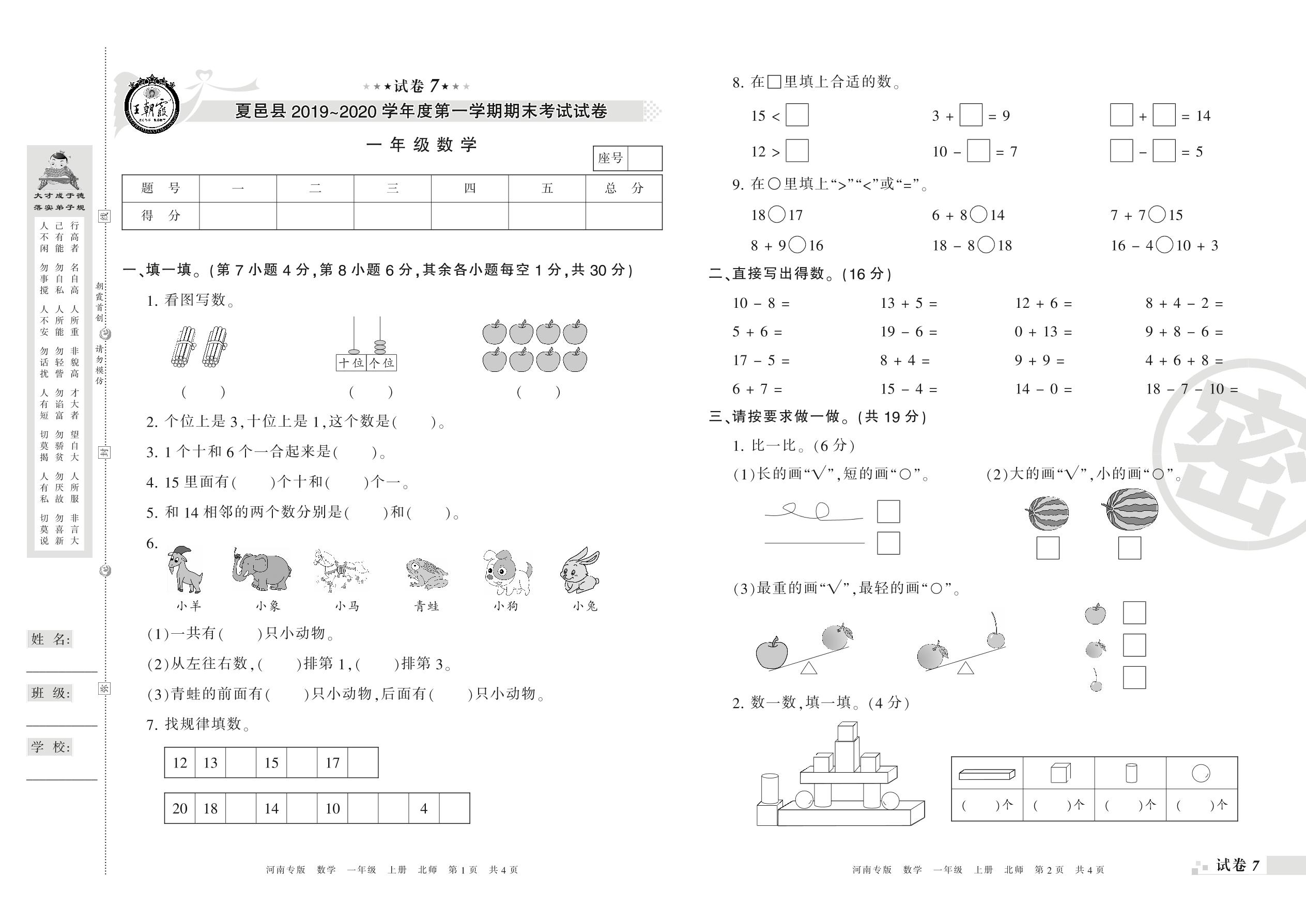 2019-2020学年第一学期商丘市夏邑县一年级数学试卷(北师版)【7】
