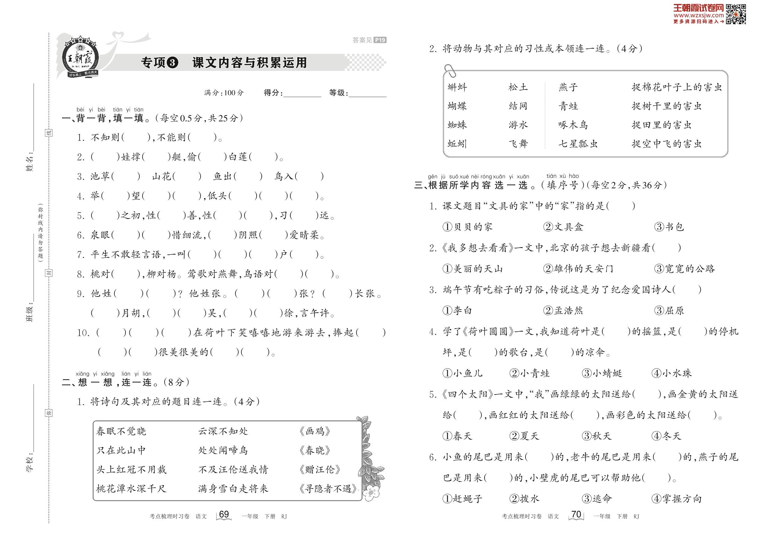 2023下册一年级语文人教版 专项3 课文内容与积累运用