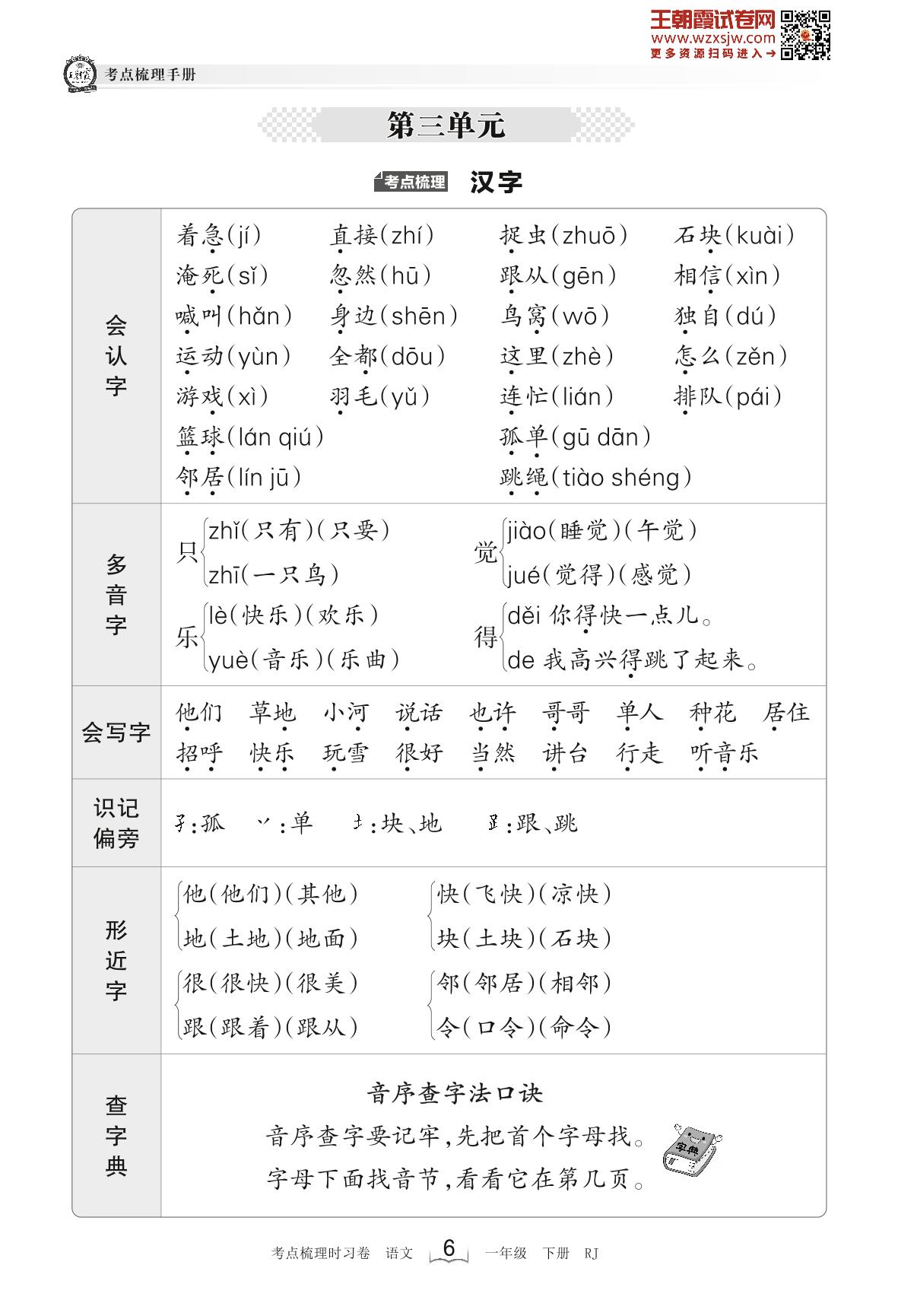 2023下册一年级语文人教版 考点梳理手册——第三单元
