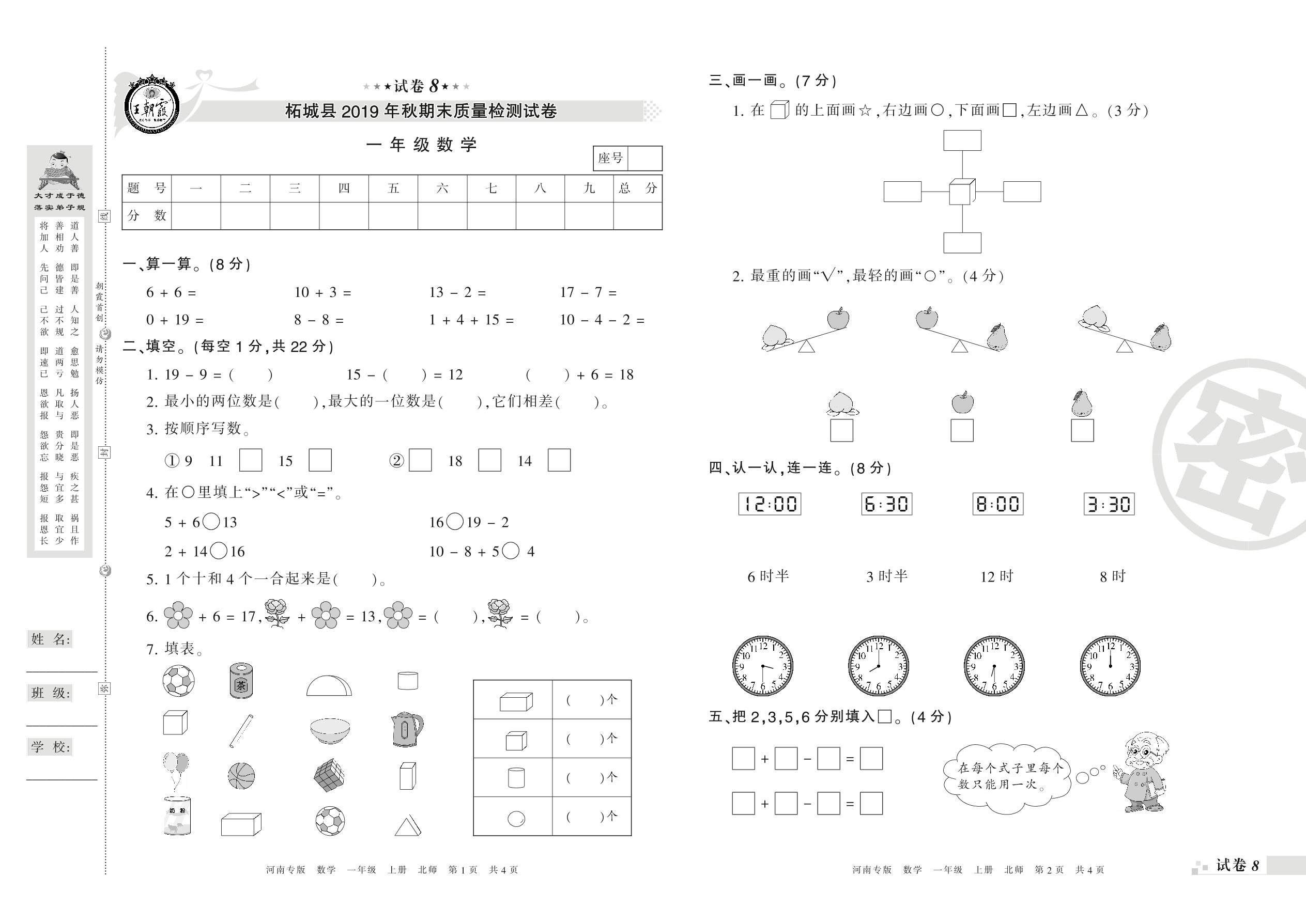 2019-2020学年第一学期商丘市柘城县一年级数学试卷(北师版)【8】