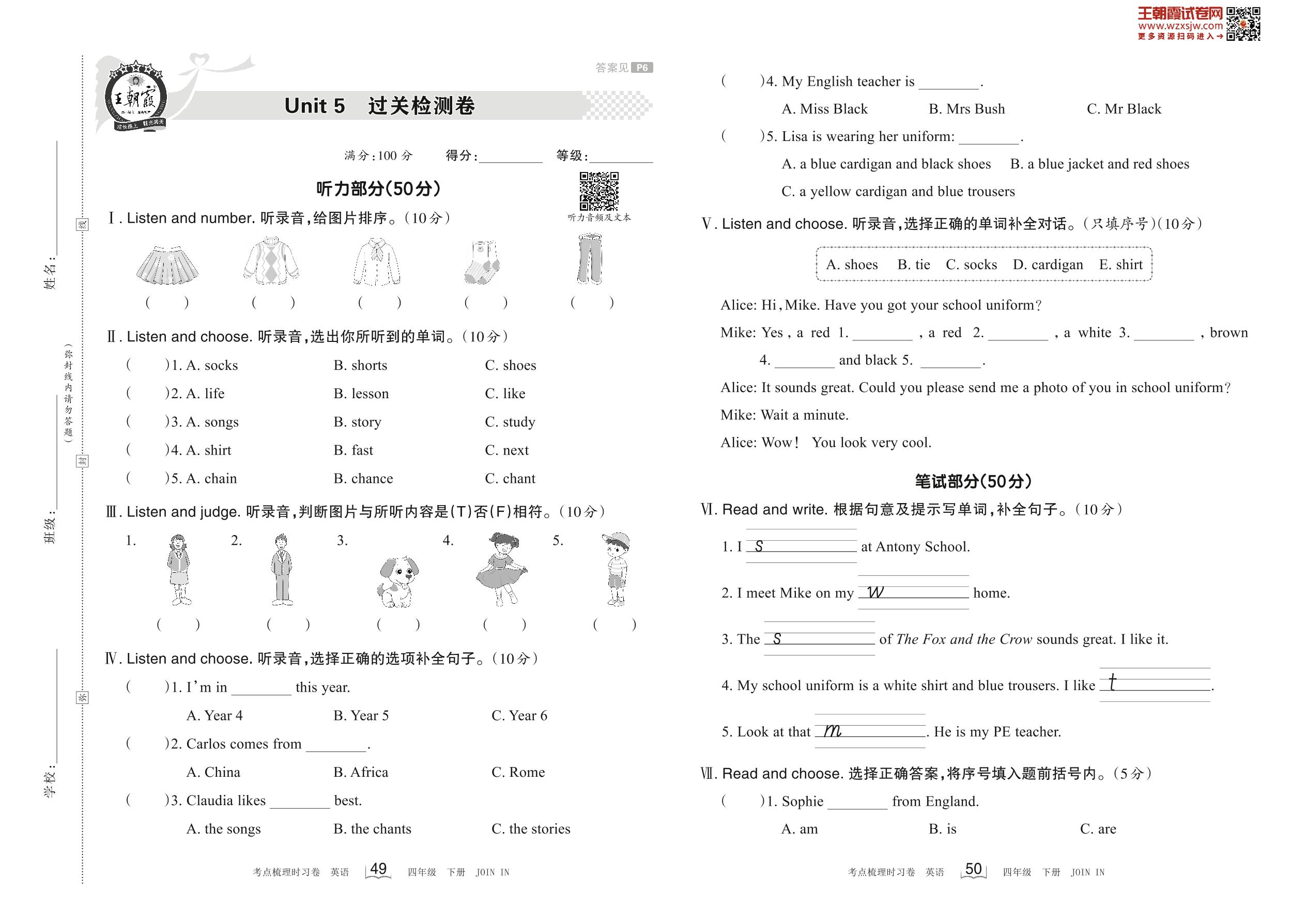 四年级英语剑桥版下册单元卷