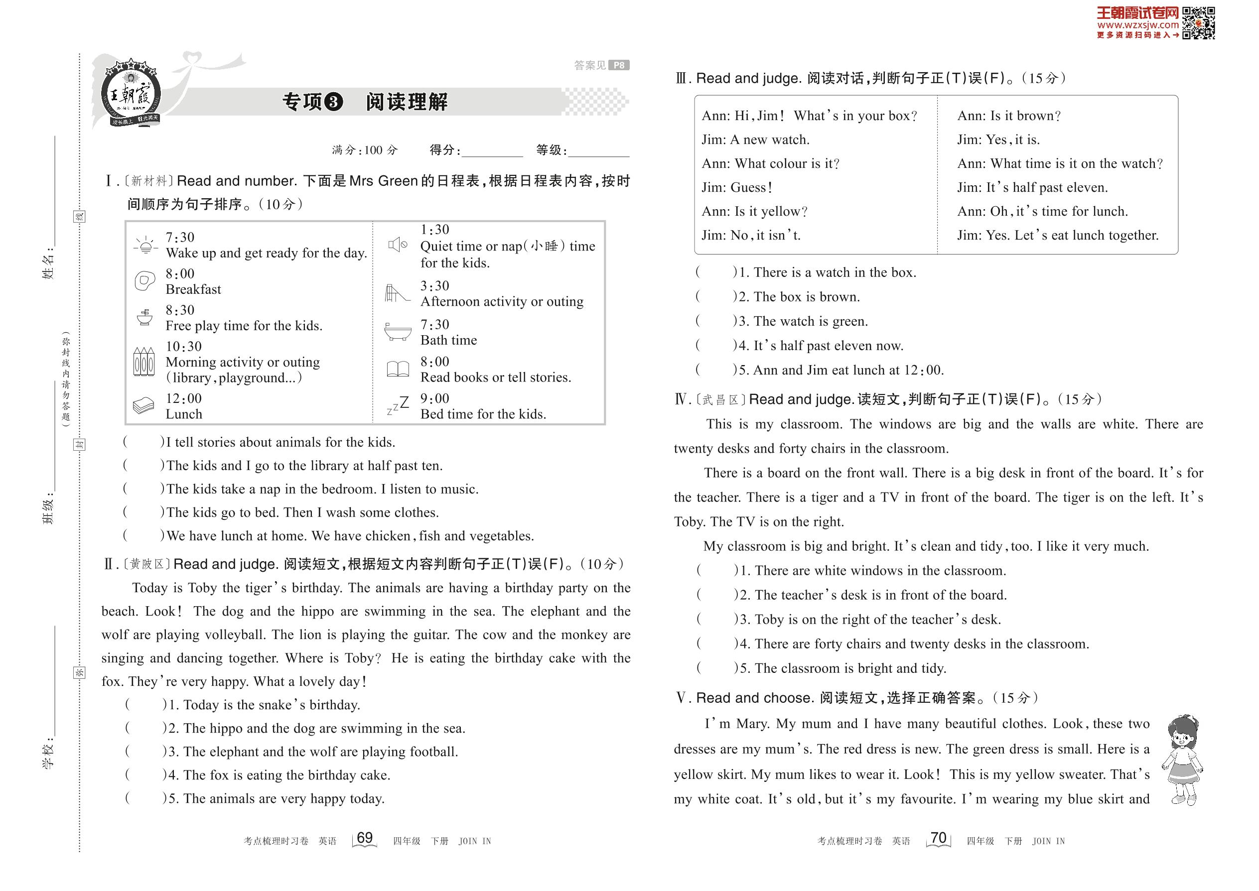 2023下册四年级英语剑桥版 专项3 阅读理解