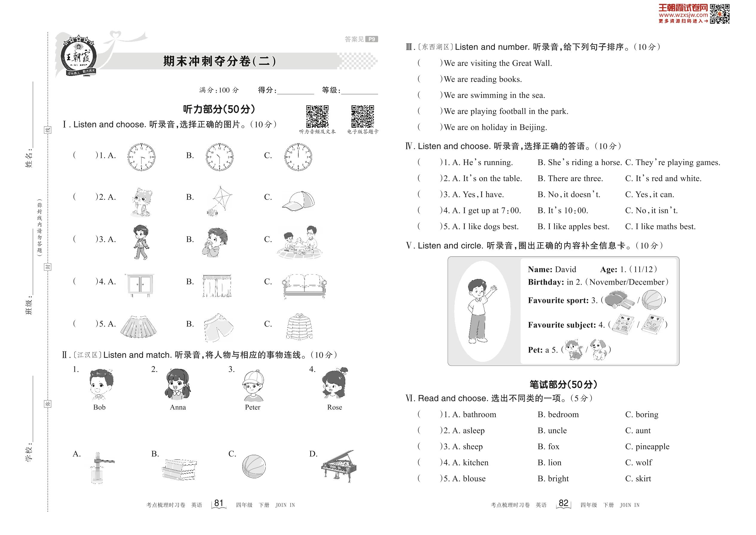 四年级英语剑桥版下册期末卷