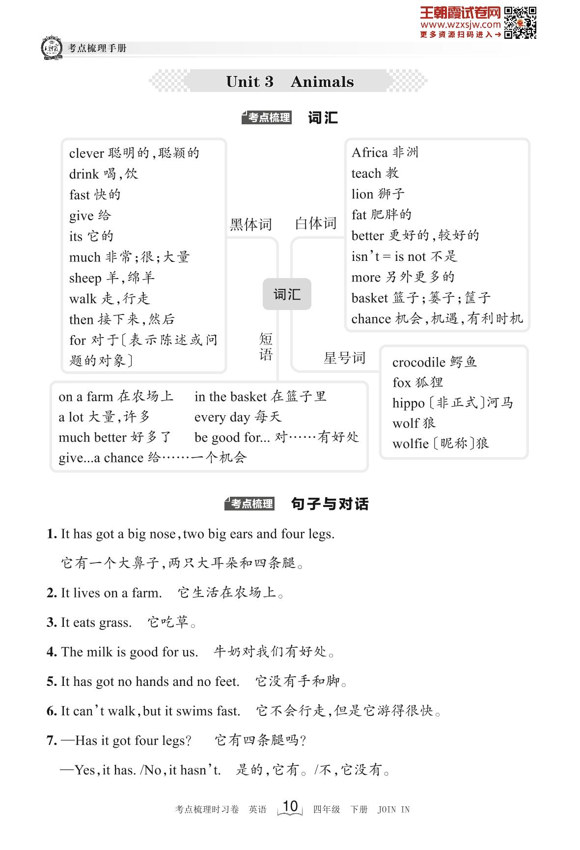 2023下册四年级英语剑桥版 考点梳理手册——Unit 3 Animals