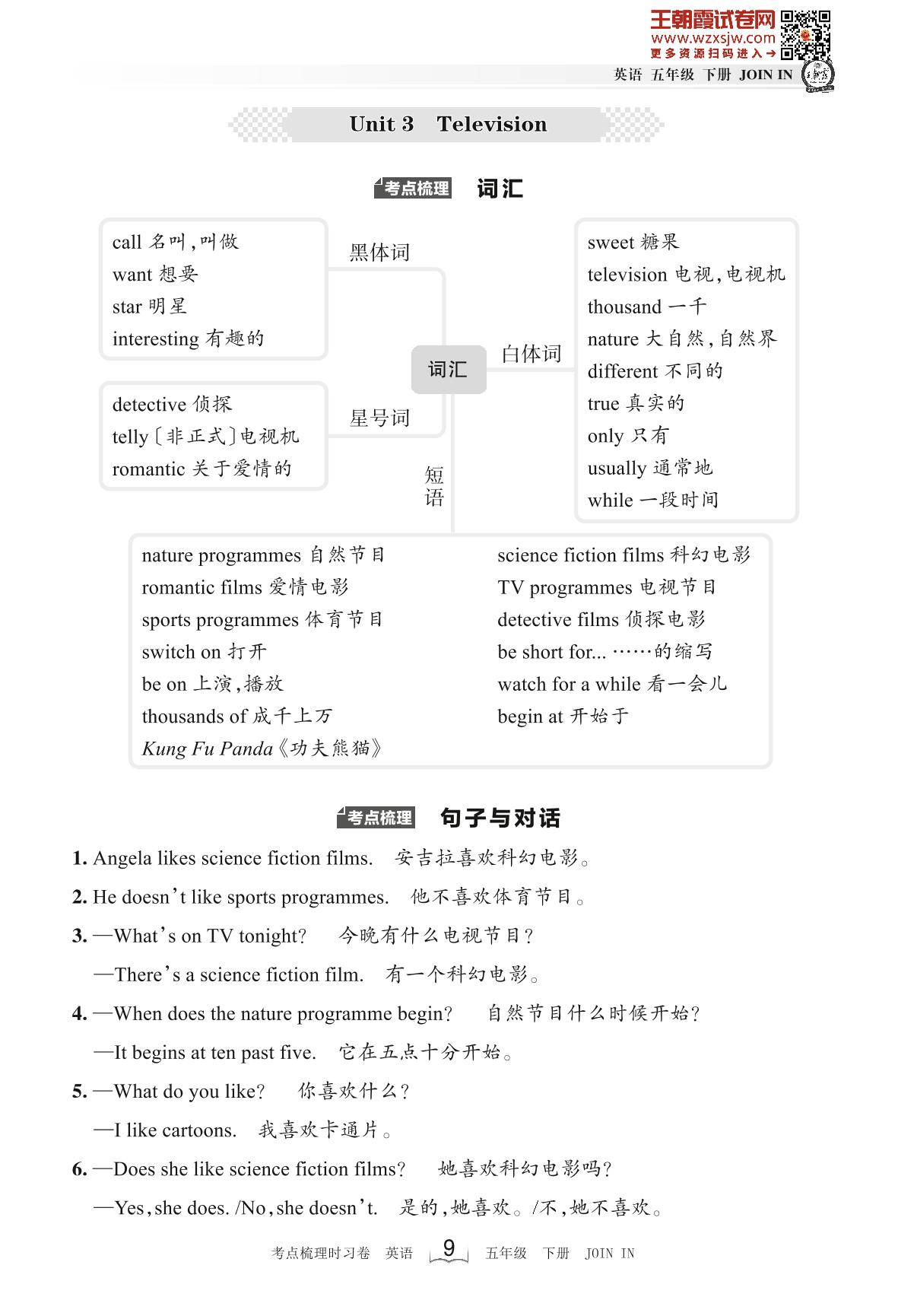 2023下册五年级英语剑桥版 考点梳理手册——Unit 3 Television