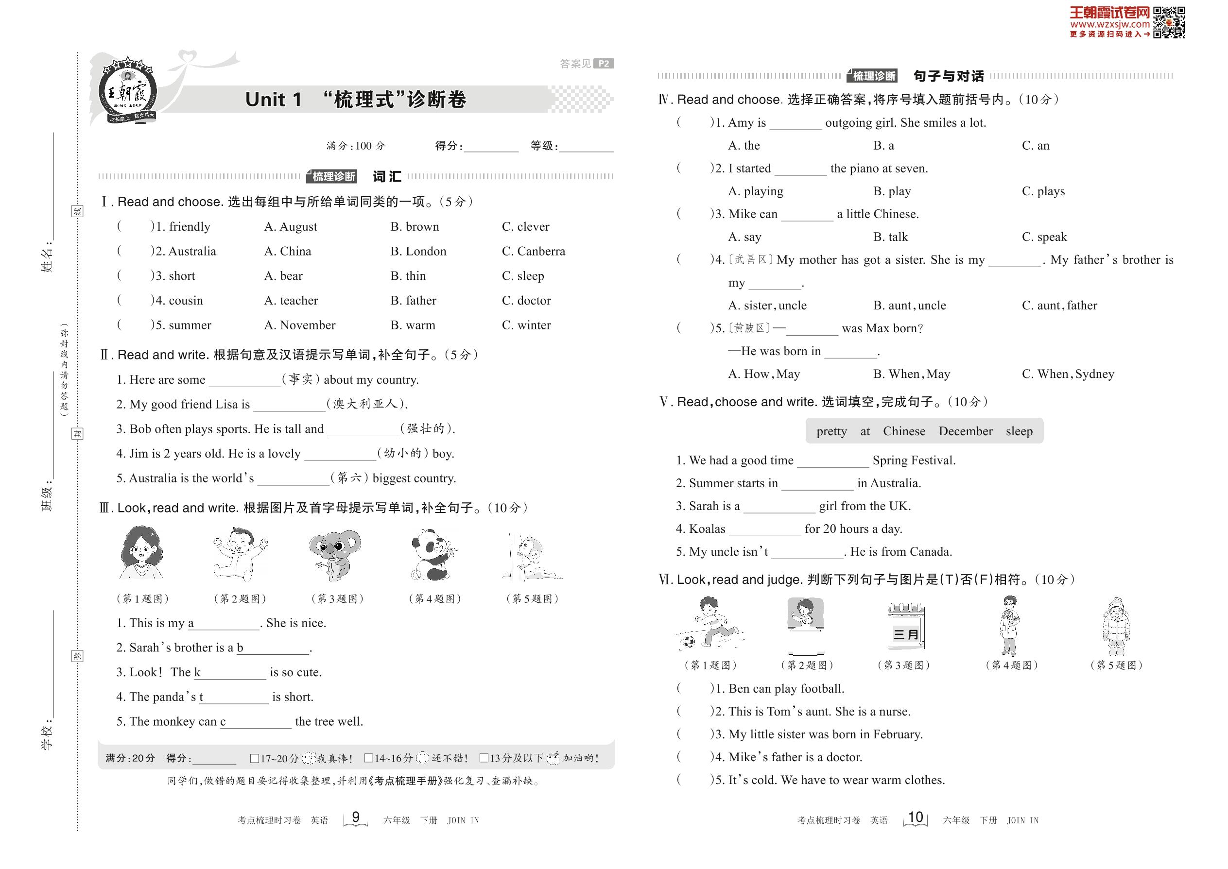 2023下册六年级英语剑桥版 Unit 1 “梳理式”诊断卷