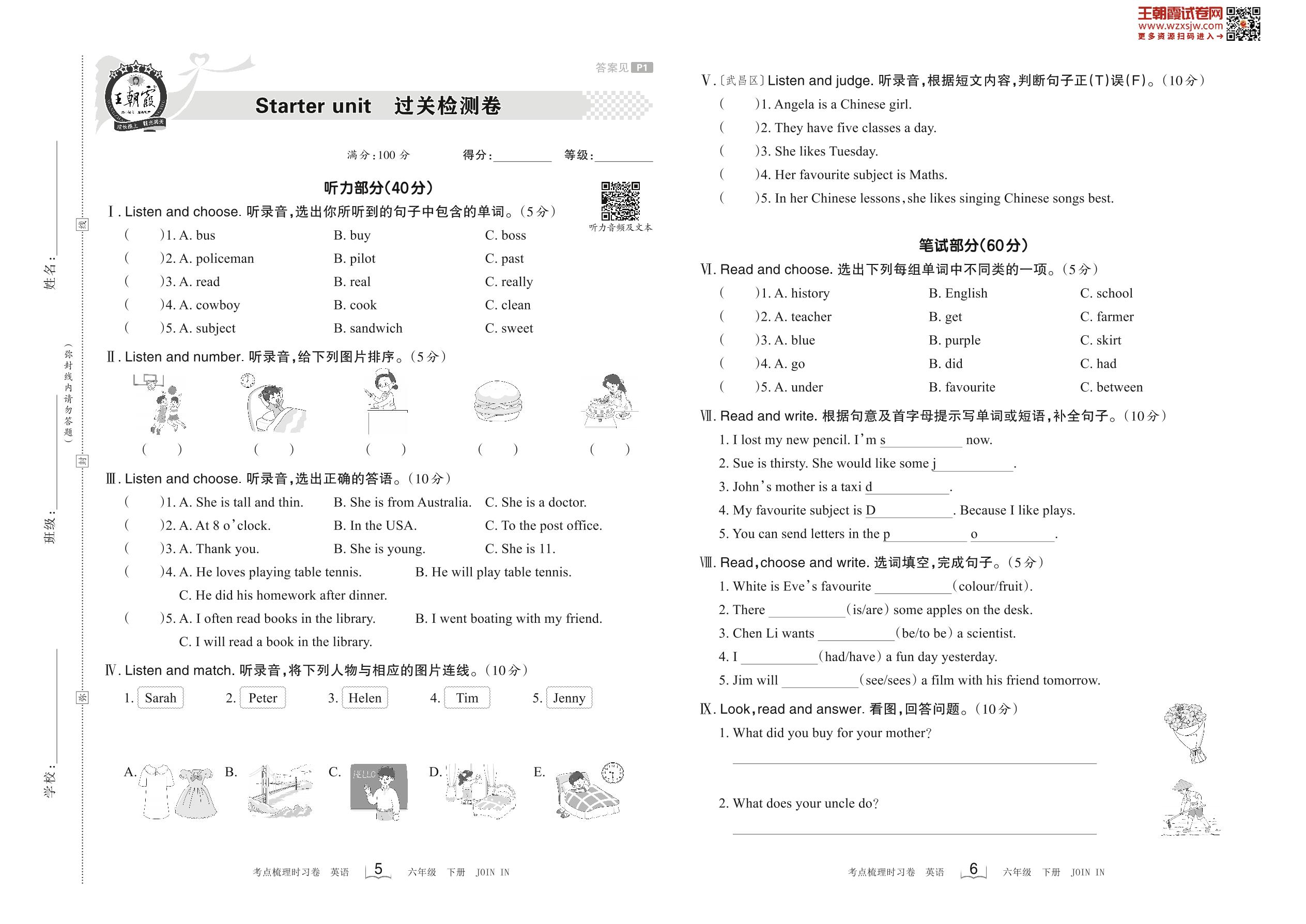 2023下册六年级英语剑桥版 Starter unit 过关检测卷