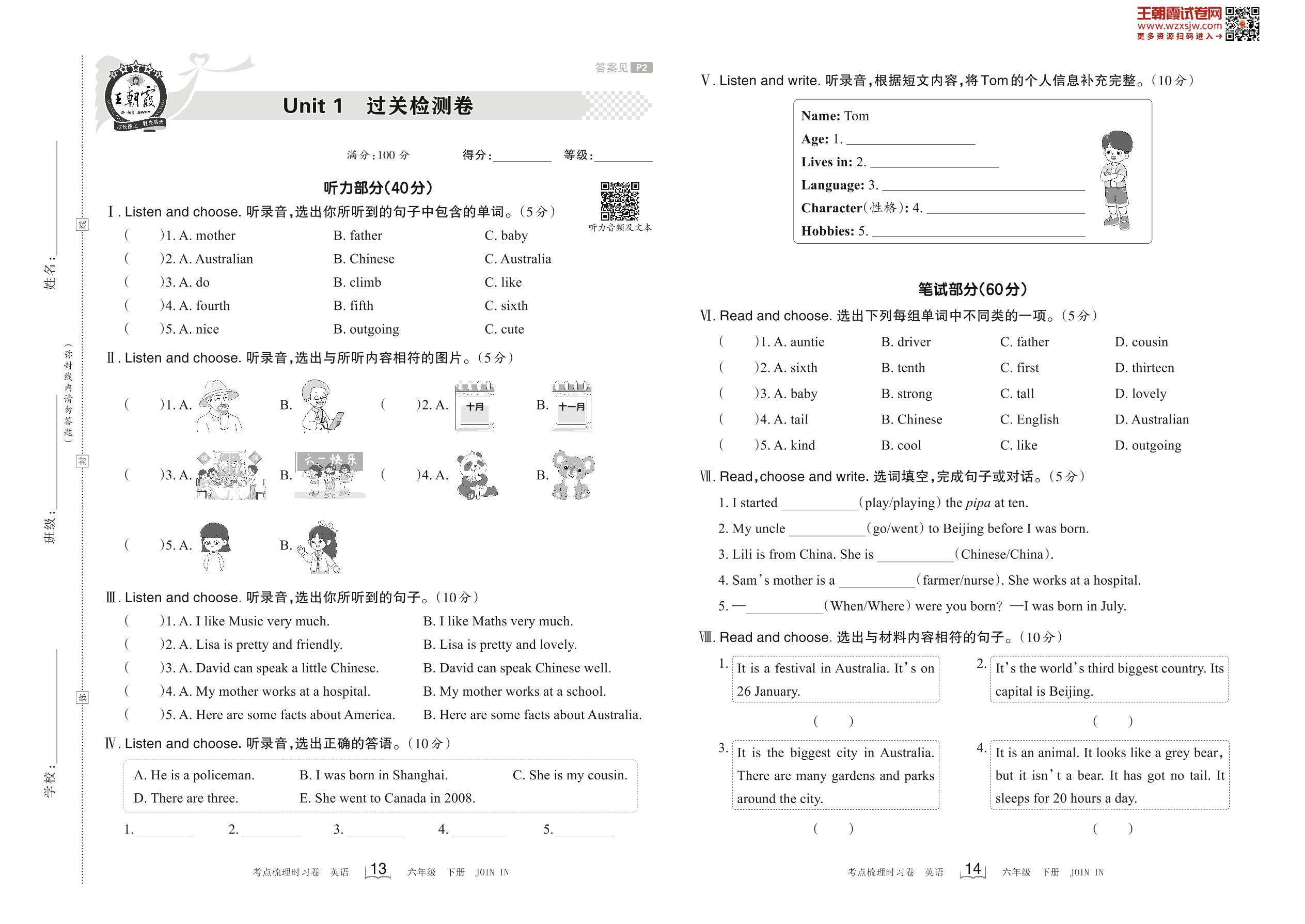 2023下册六年级英语剑桥版 Unit 1 过关检测卷