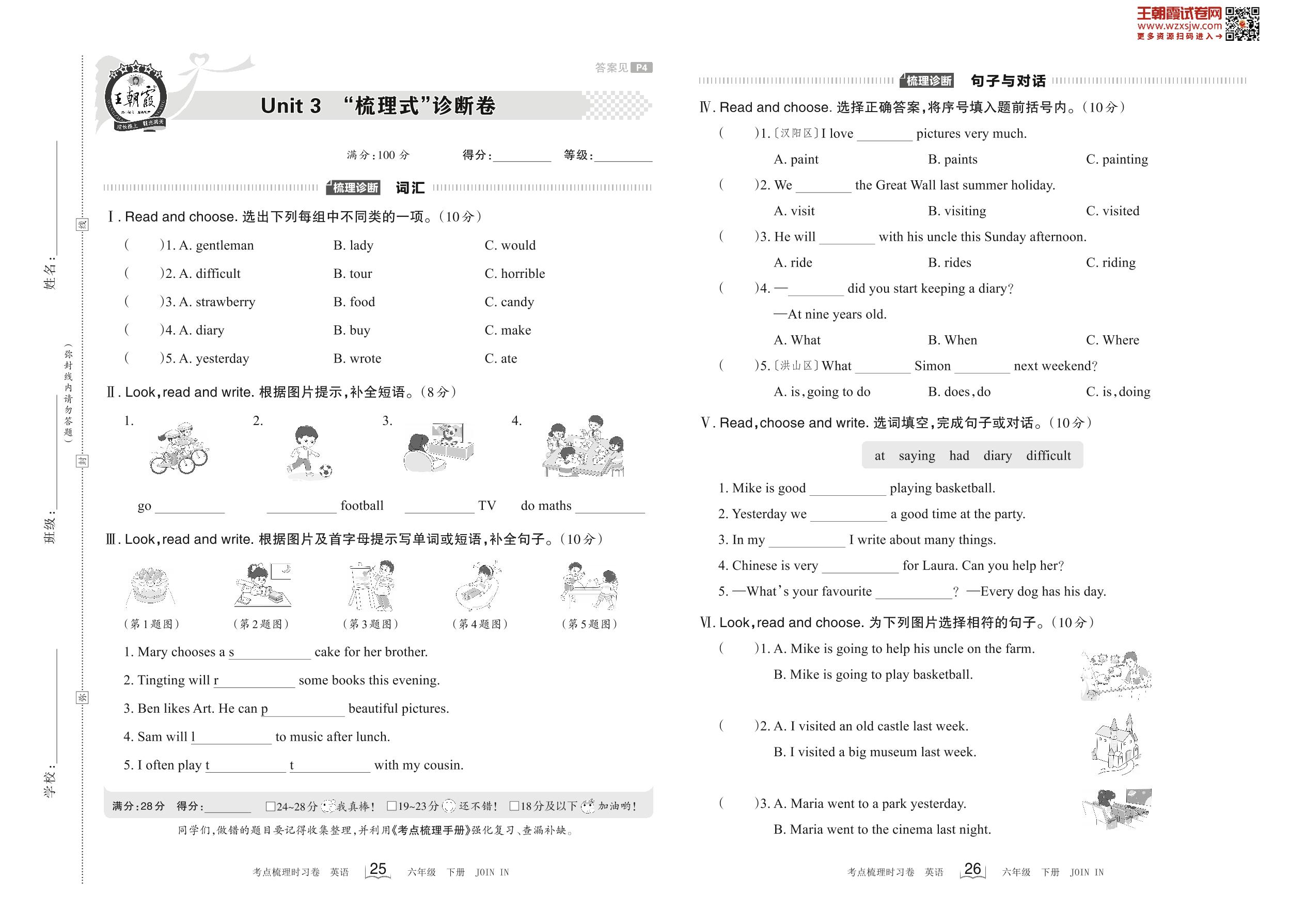 2023下册六年级英语剑桥版 Unit 3 “梳理式”诊断卷