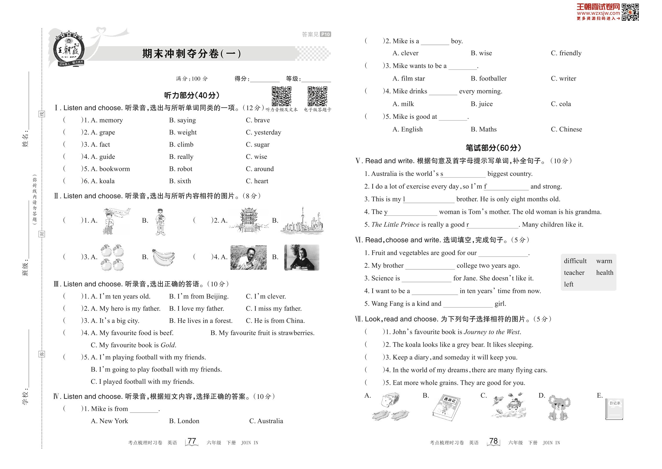 2023下册六年级英语剑桥版 期末冲刺夺分卷(一)