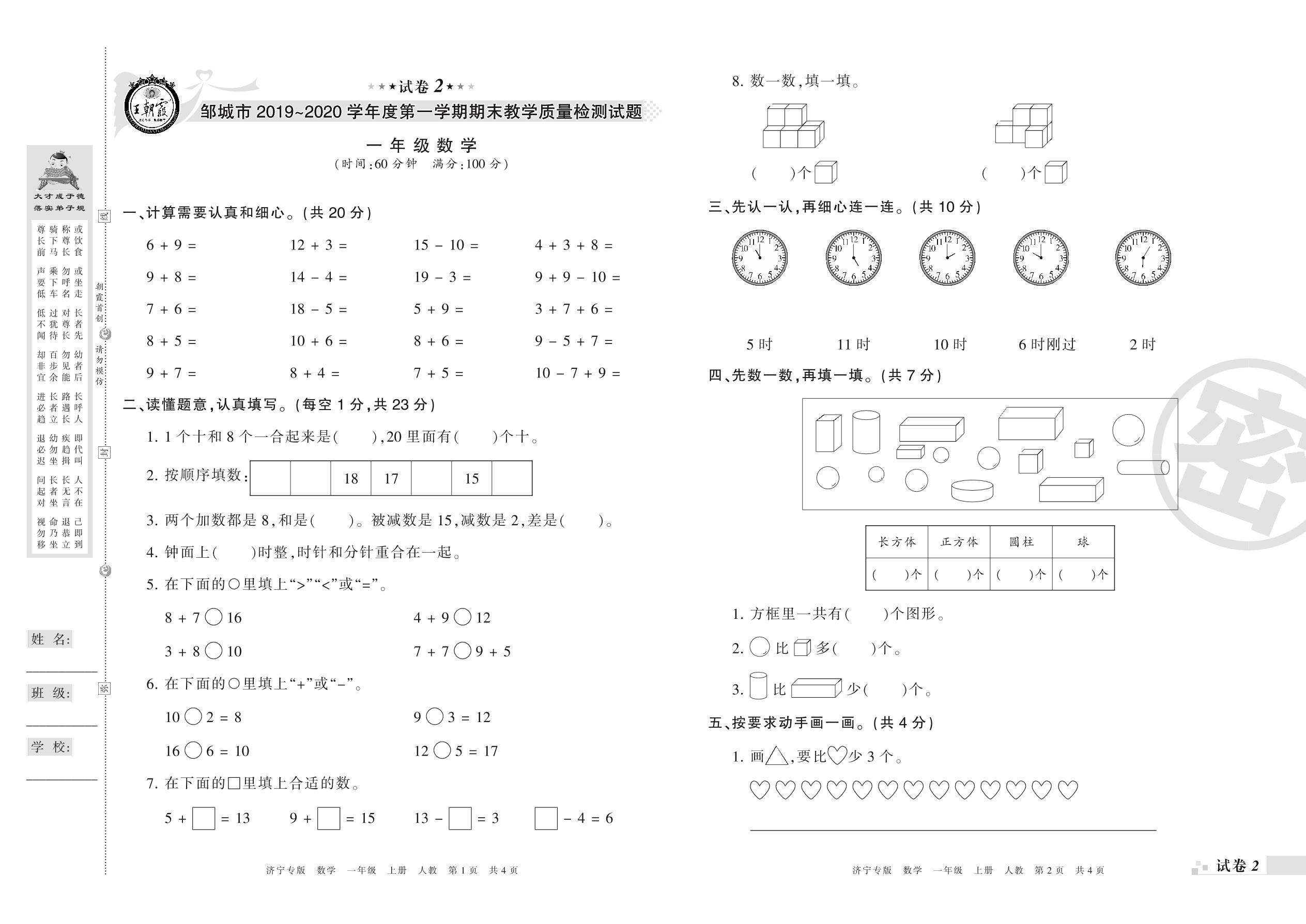 2019-2020学年第一学期邹城市一年级数学试卷(人教版)【2】