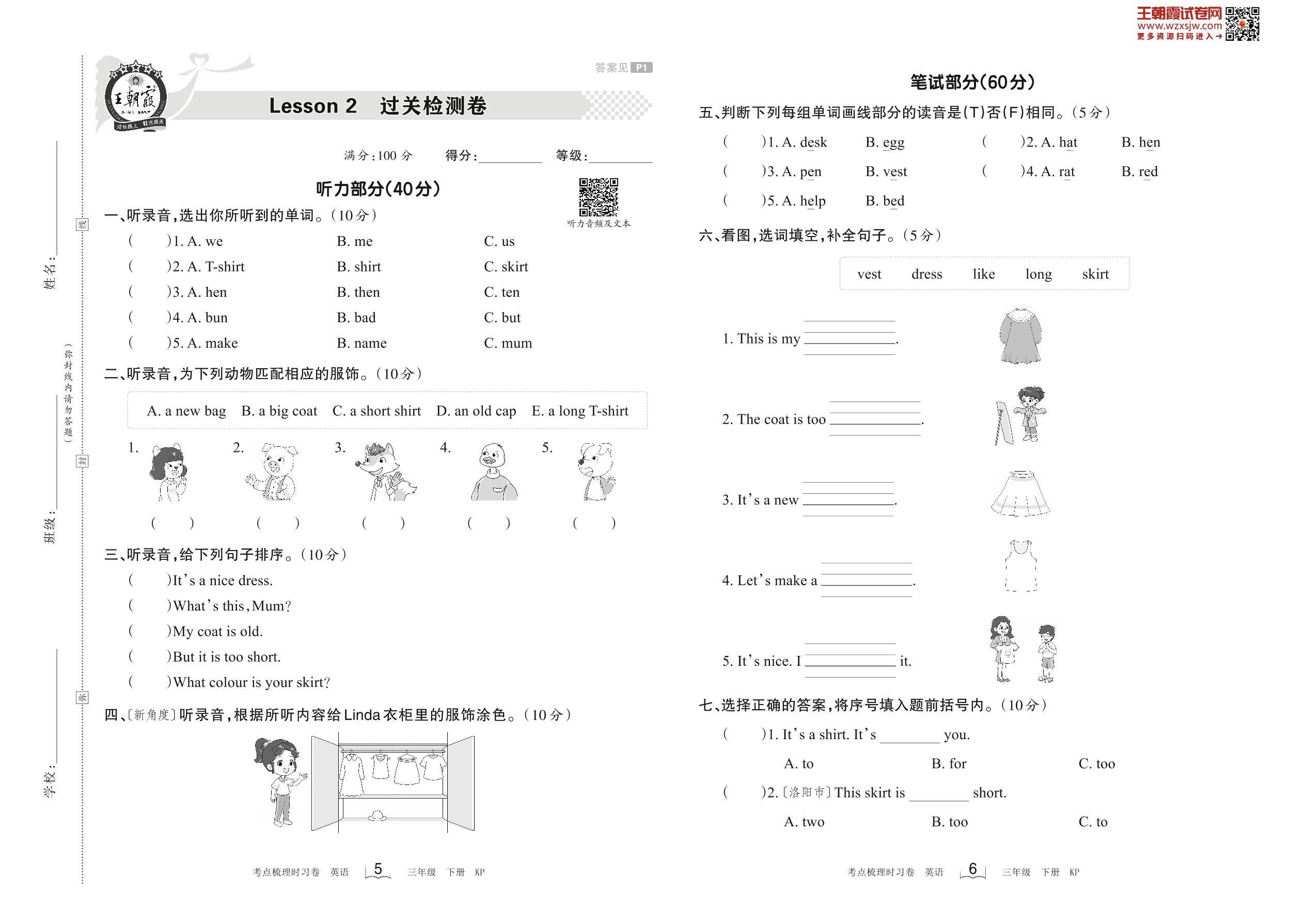 2023下册三年级英语科普版 Lesson 2 过关检测卷