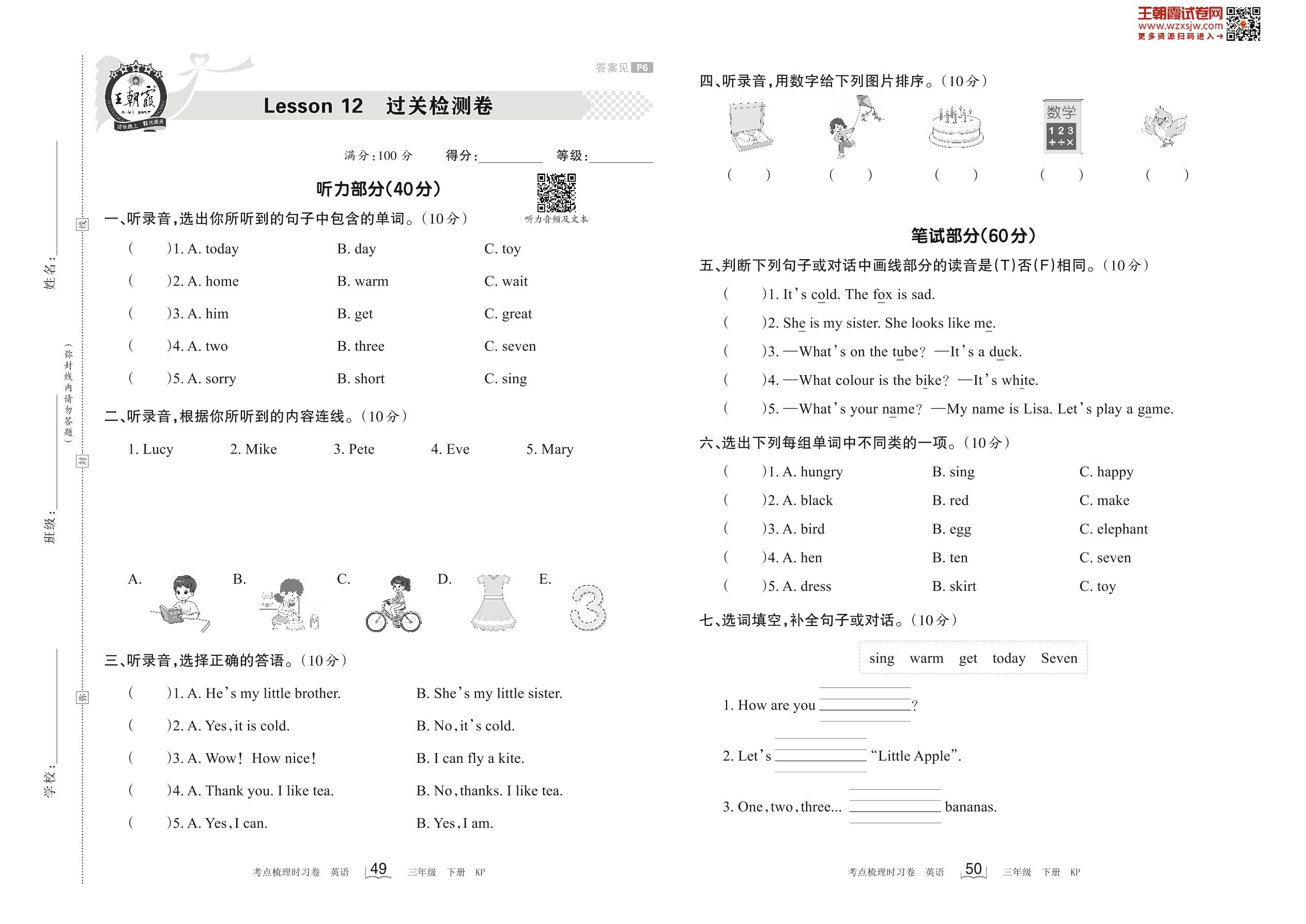 2023下册三年级英语科普版 Lesson 12 过关检测卷
