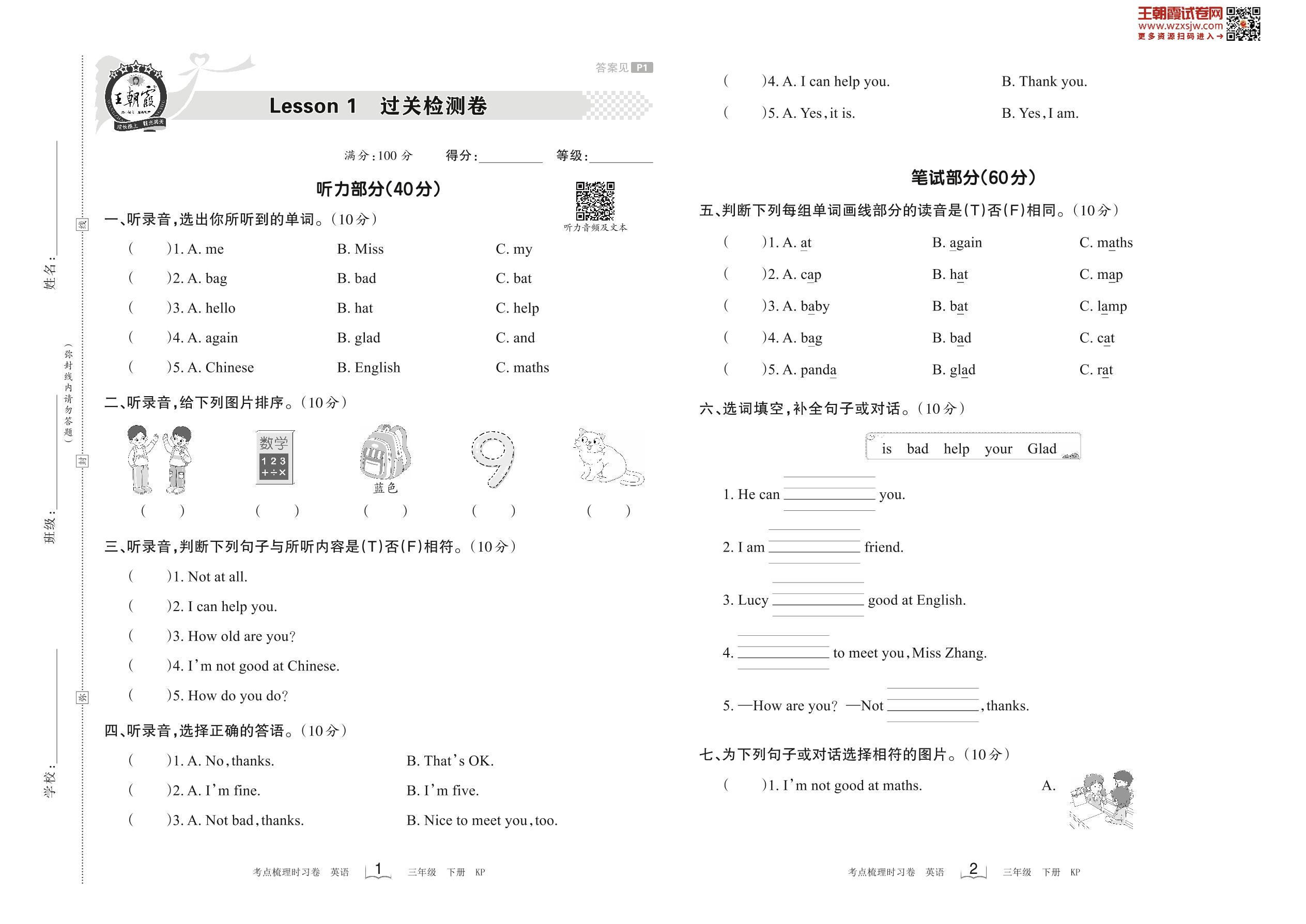 2023下册三年级英语科普版 Lesson 1 过关检测卷