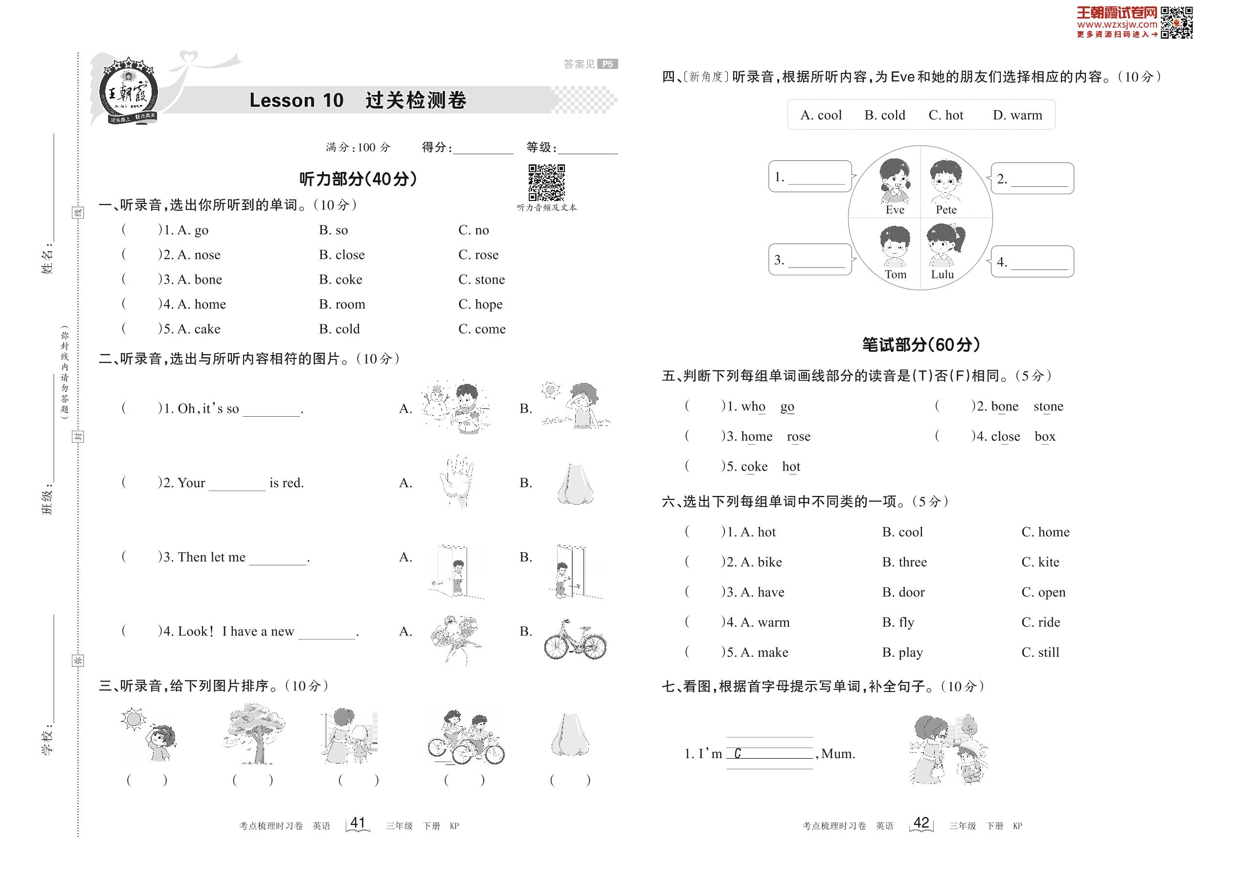 2023下册三年级英语科普版 Lesson 10 过关检测卷