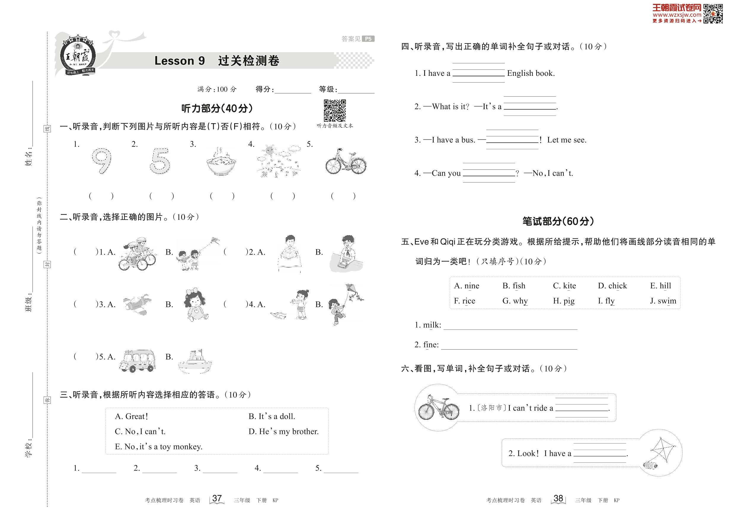 2023下册三年级英语科普版 Lesson 9 过关检测卷