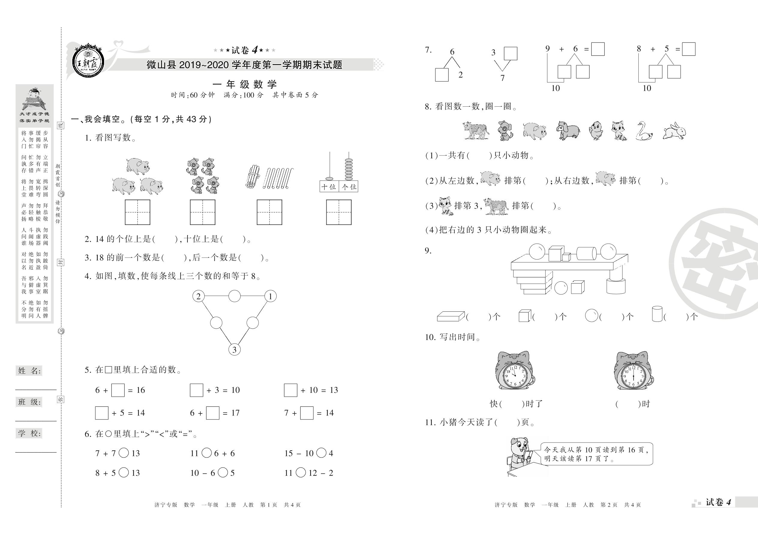 2019-2020学年第一学期济宁市微山县一年级数学试卷(人教版)【4】