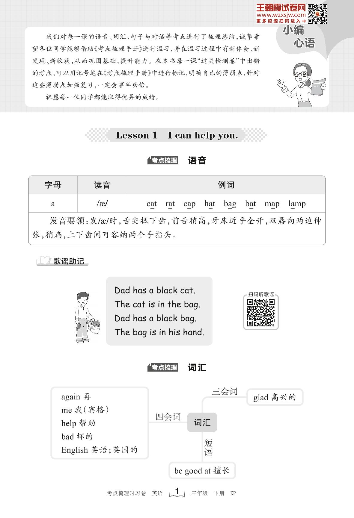 2023下册三年级英语科普版 考点梳理手册——Lesson 1 I can help you.