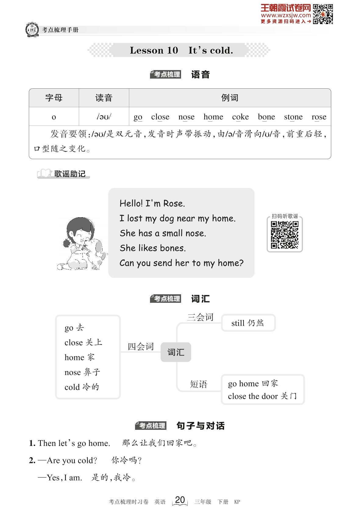 2023下册三年级英语科普版 考点梳理手册——Lesson 10 It’s cold.