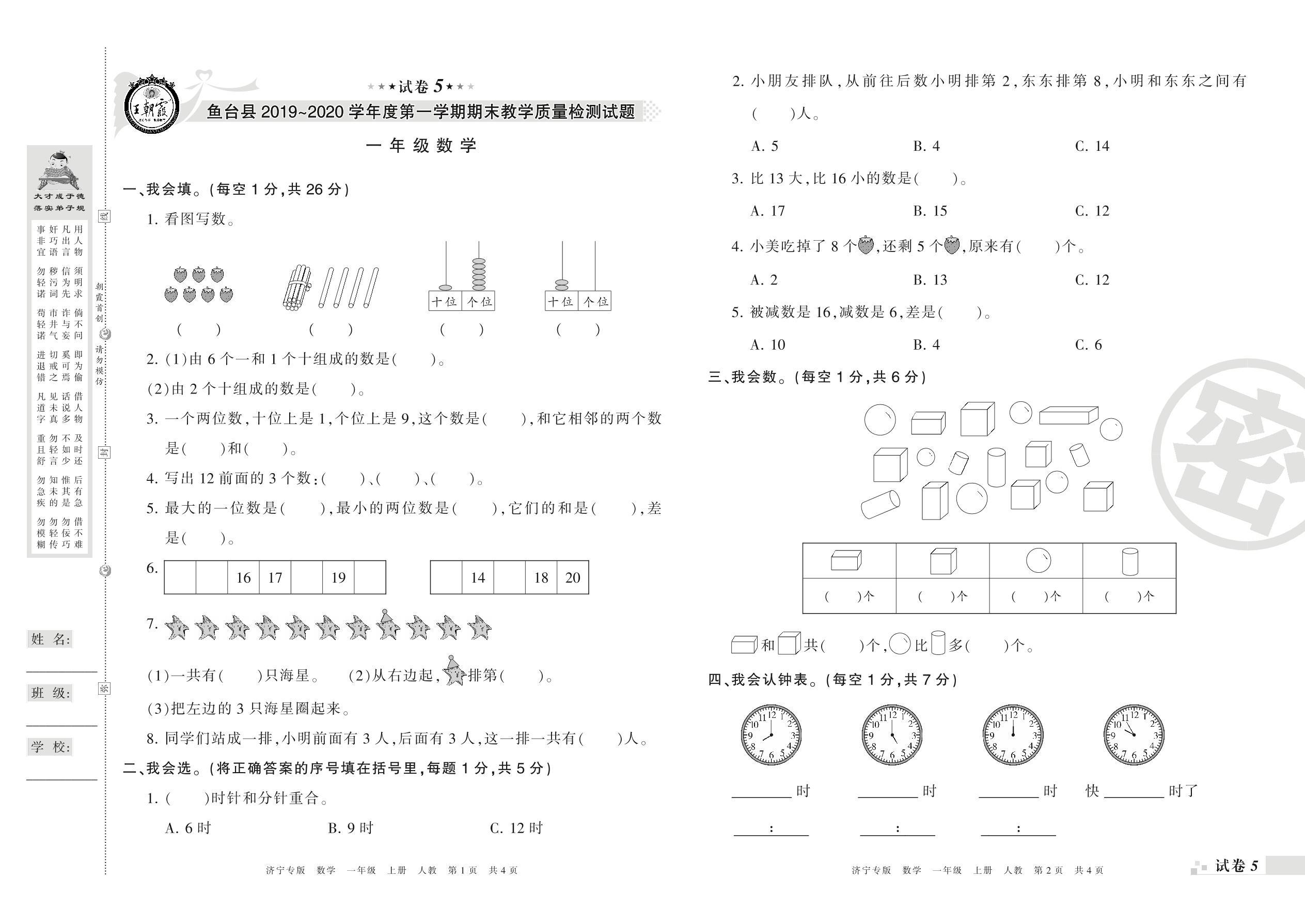 2019-2020学年第一学期济宁市鱼台县一年级数学试卷(人教版)【5】