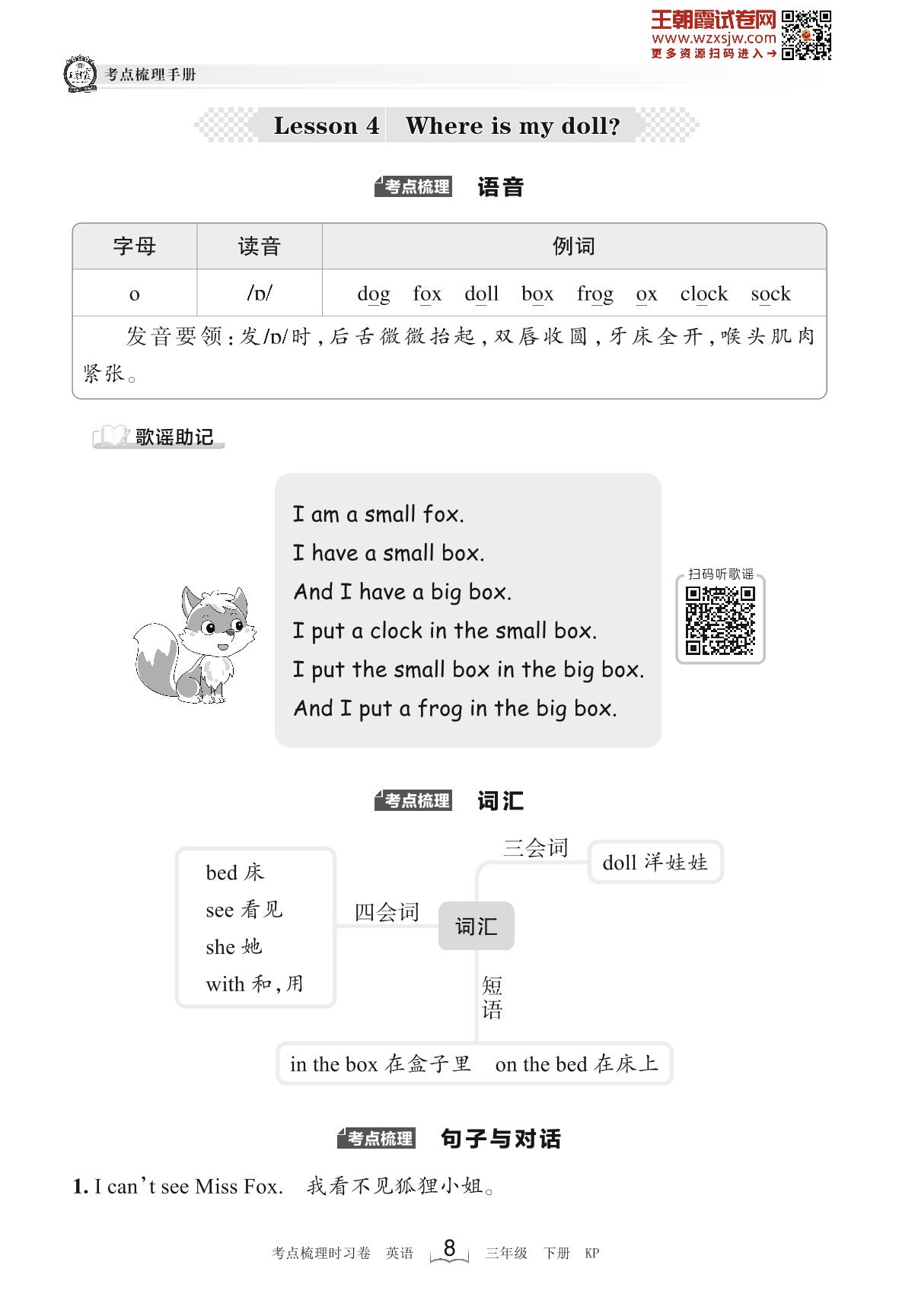 2023下册三年级英语科普版 考点梳理手册——Lesson 4 Where is my doll?