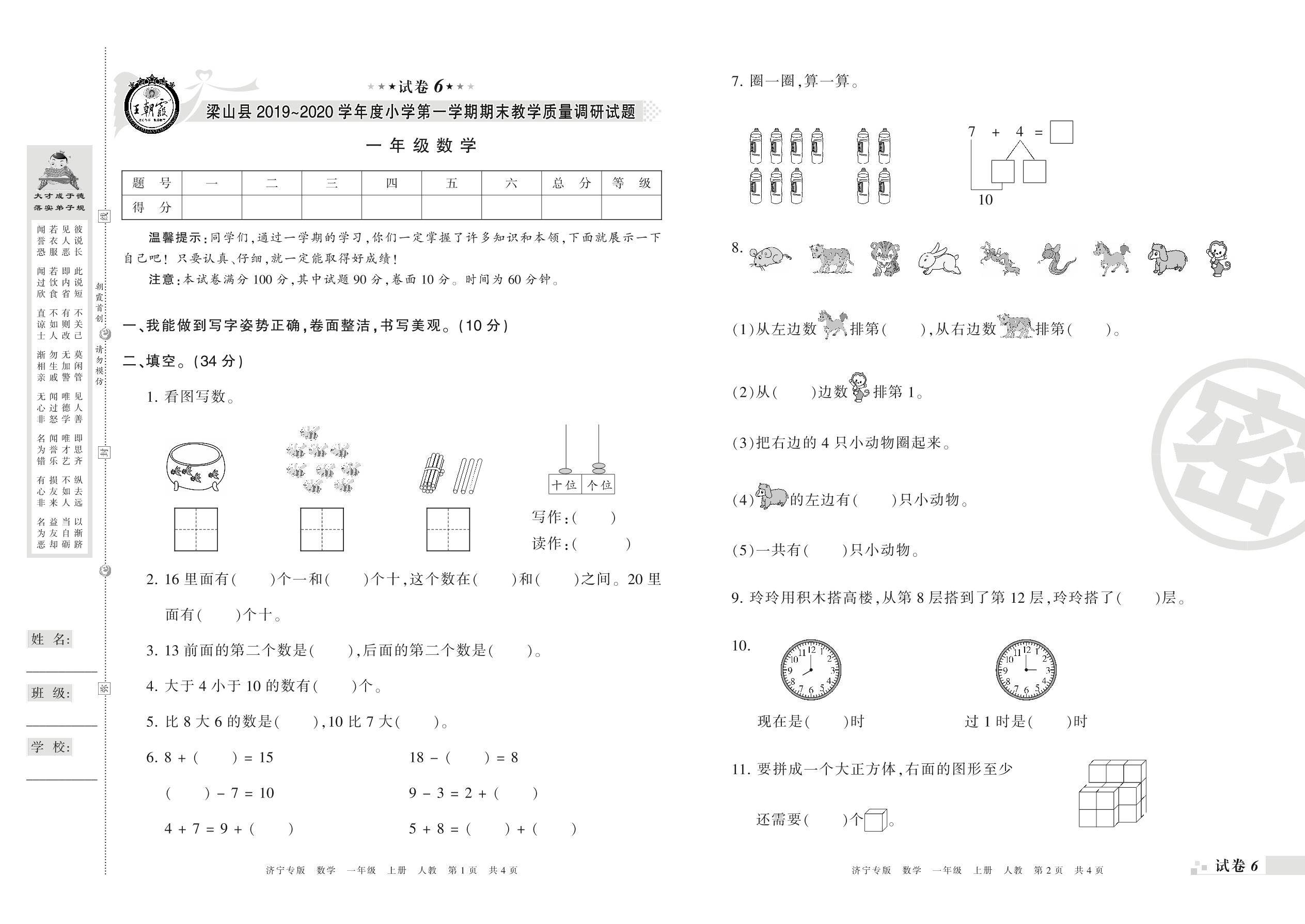 2019-2020学年第一学期济宁市梁山县一年级数学试卷(人教版)【6】