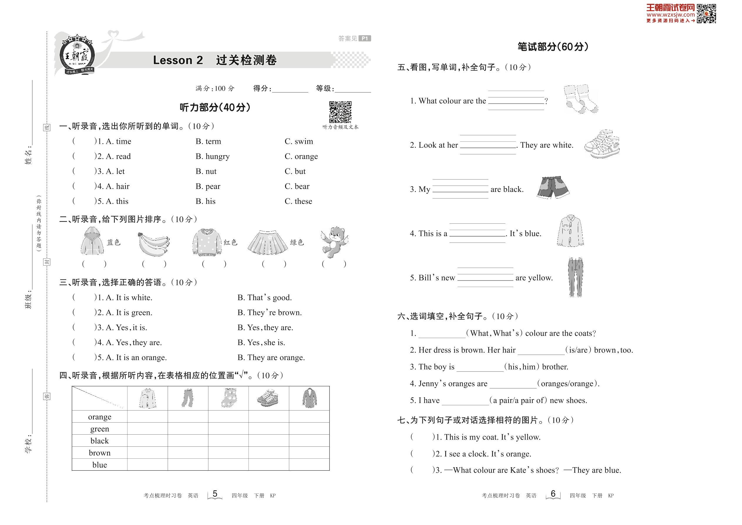 2023下册四年级英语科普版 Lesson 2 过关检测卷