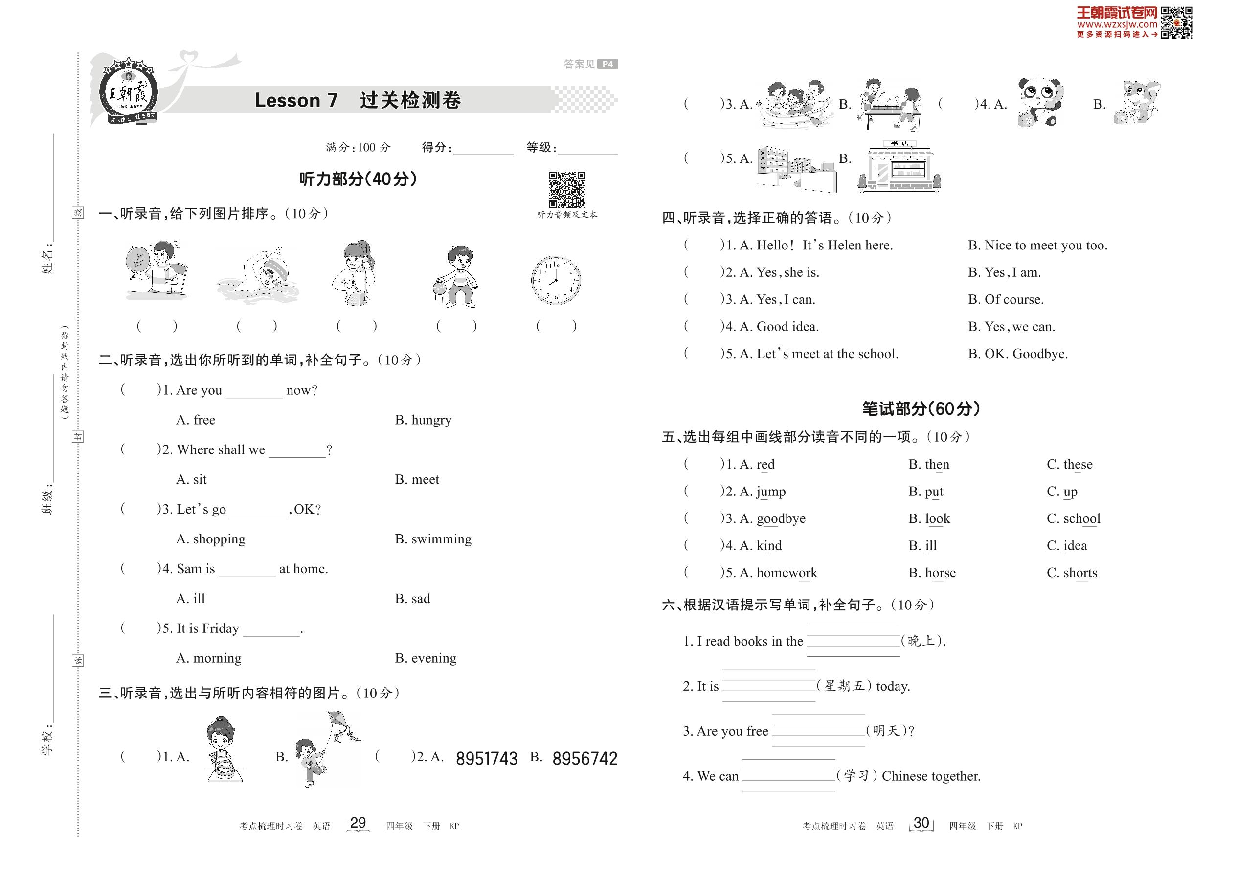 2023下册四年级英语科普版 Lesson 7 过关检测卷