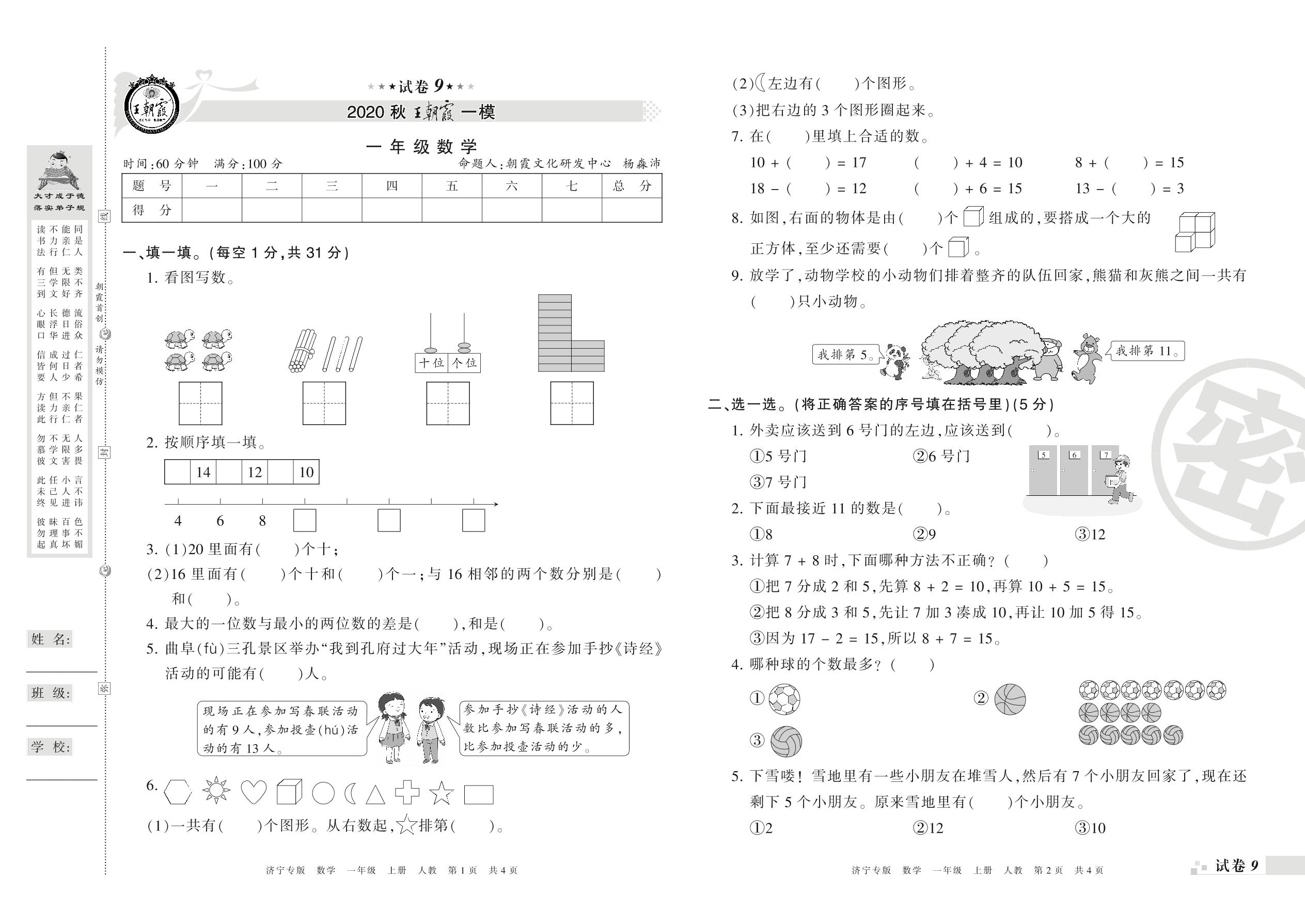 王朝霞期末模拟卷一年级上册数学(人教版)_R210802211923【9】