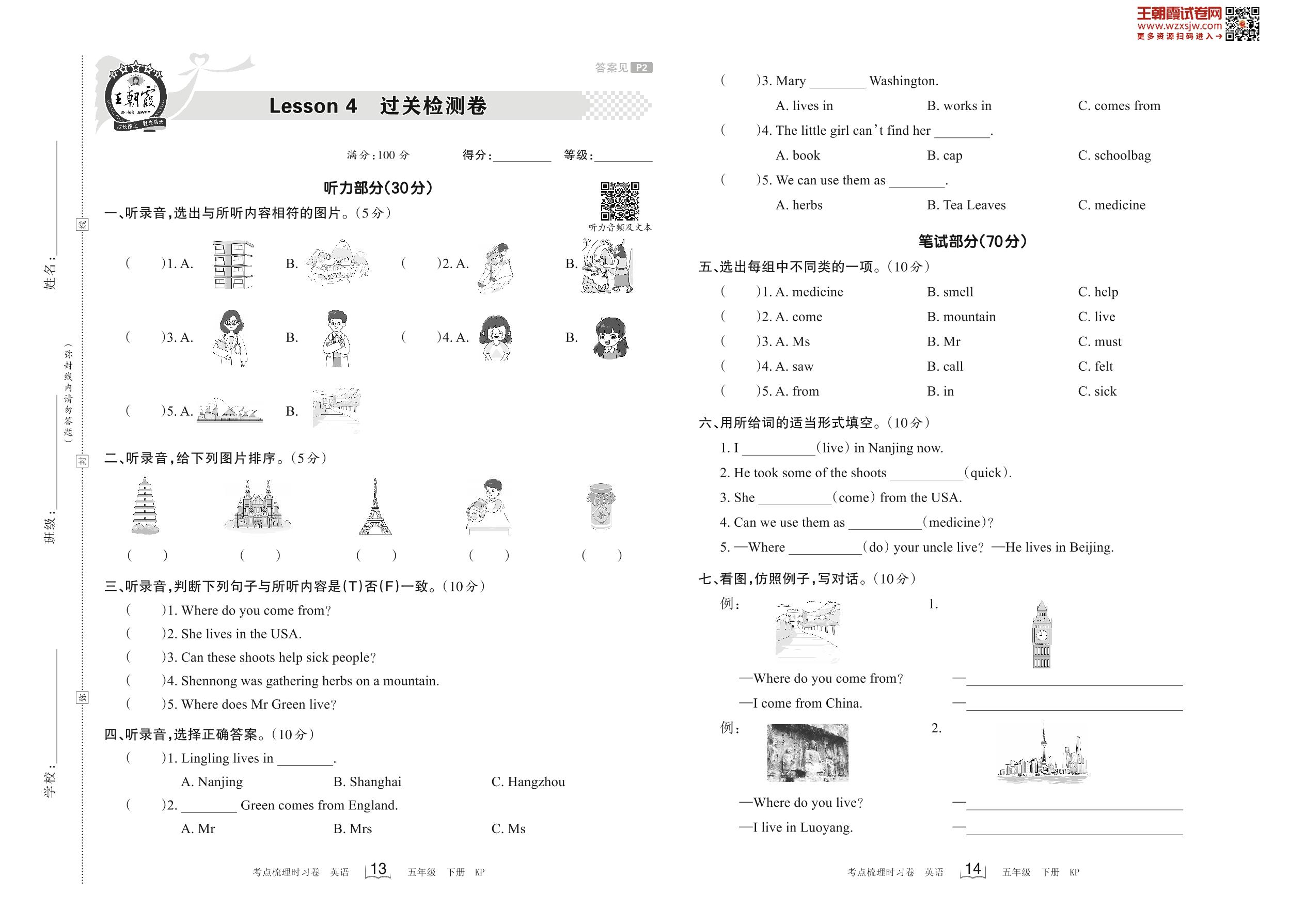2023下册五年级英语科普版 Lesson 4 过关检测卷