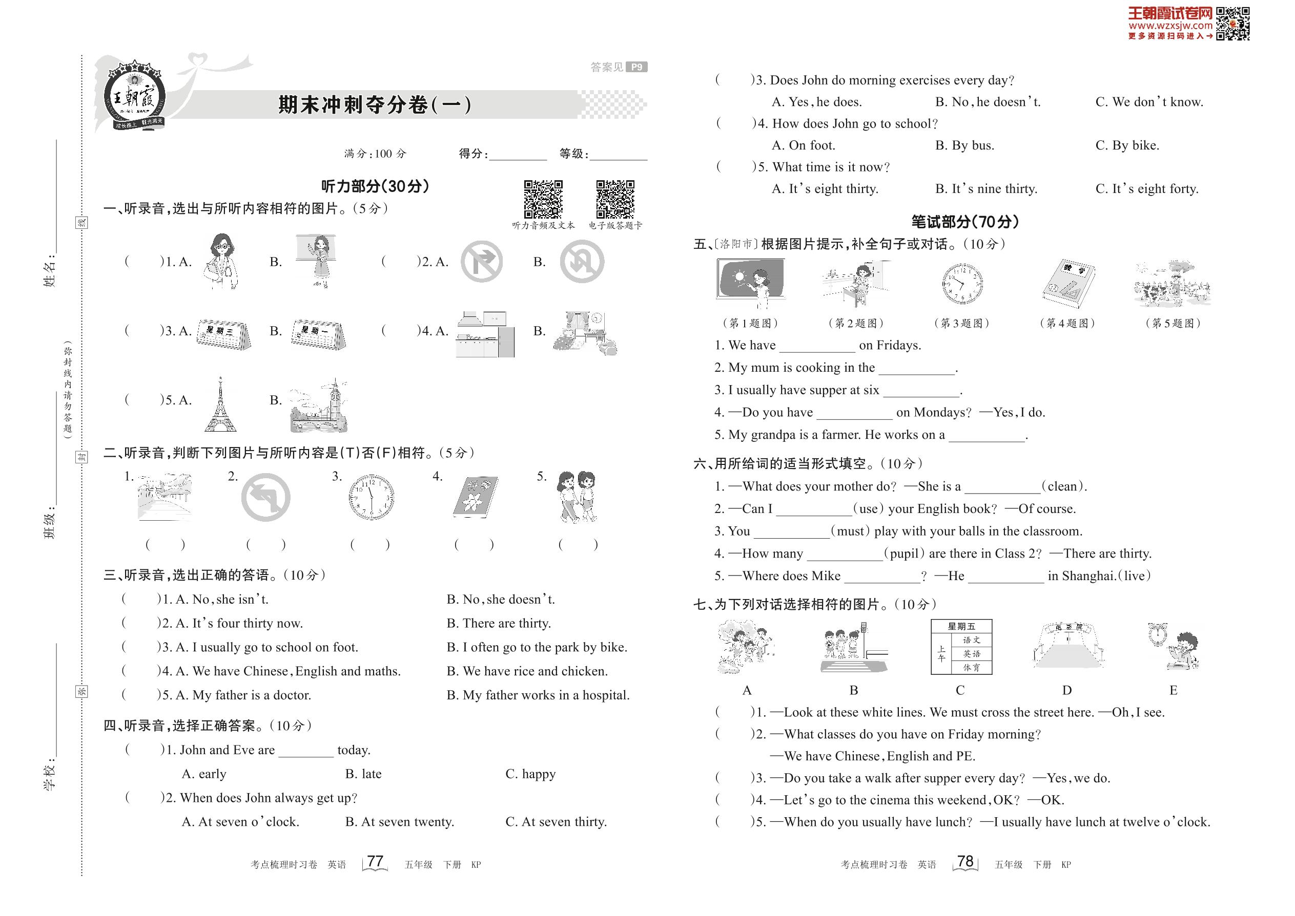 2023下册五年级英语科普版 期末冲刺夺分卷(一)