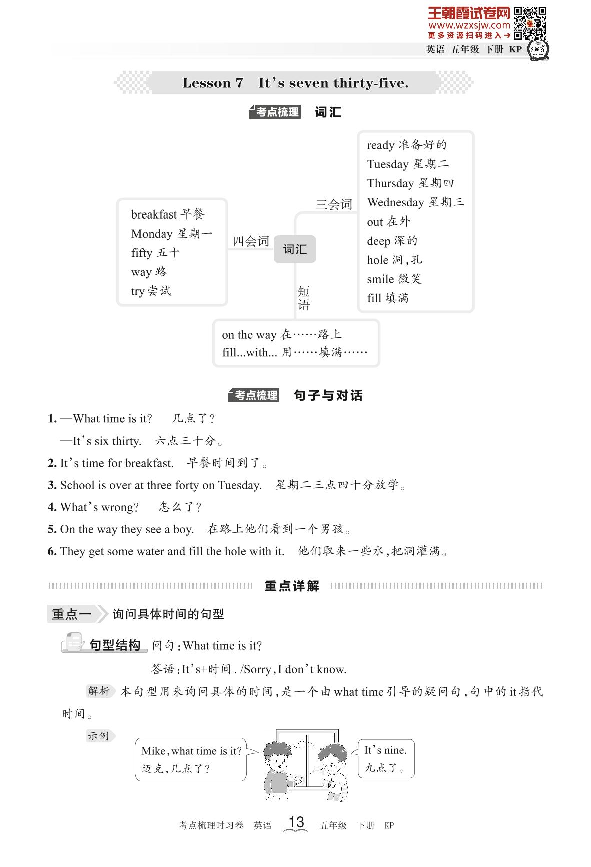 2023下册五年级英语科普版 考点梳理手册——Lesson 7 It’s seven thirty-five.