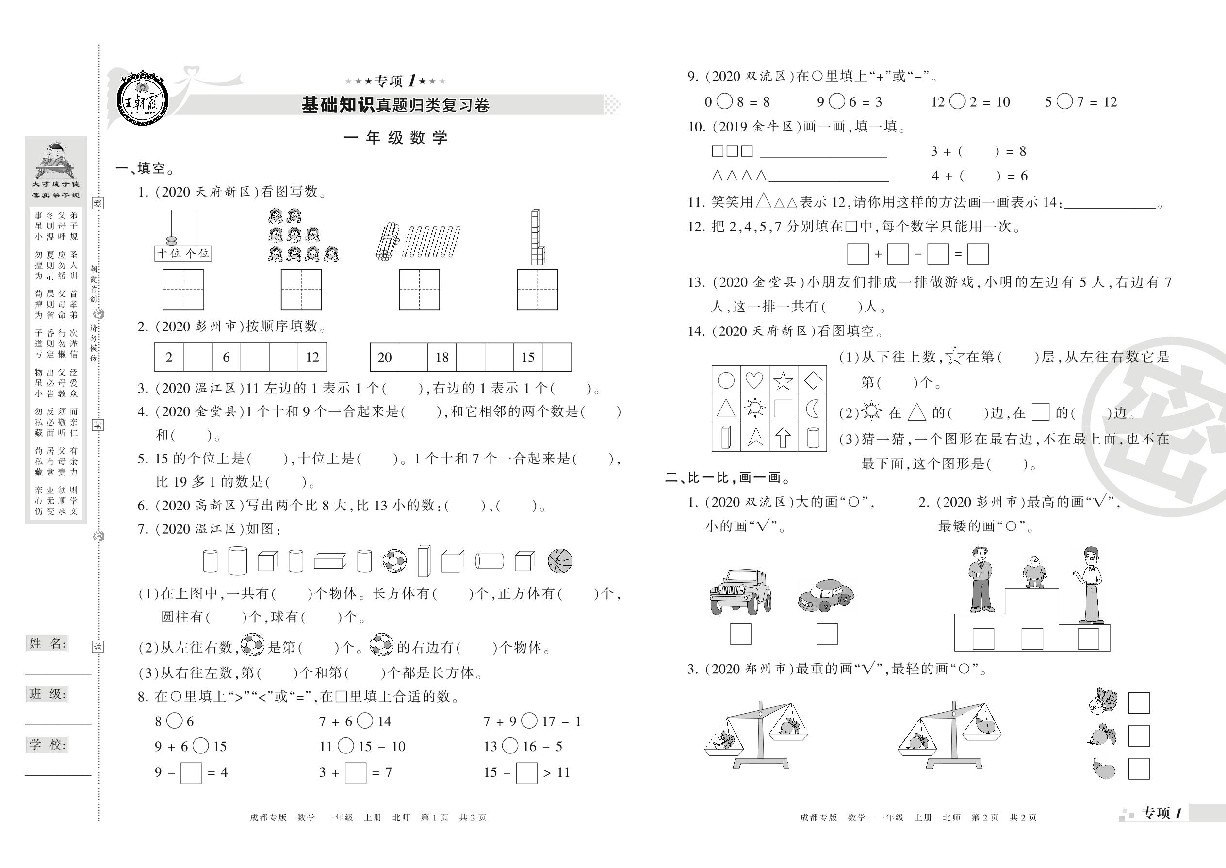 王朝霞期末专项卷——基础知识、计算真题归类复习一年级上册数学(北师版)_R210802211942【0】