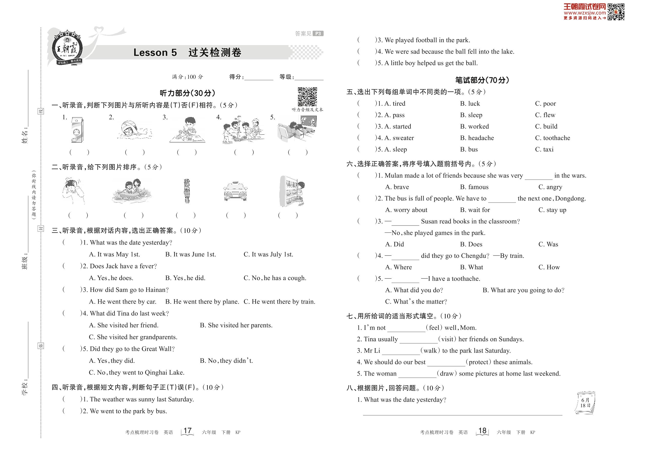 2023下册六年级英语科普版 Lesson 5 过关检测卷