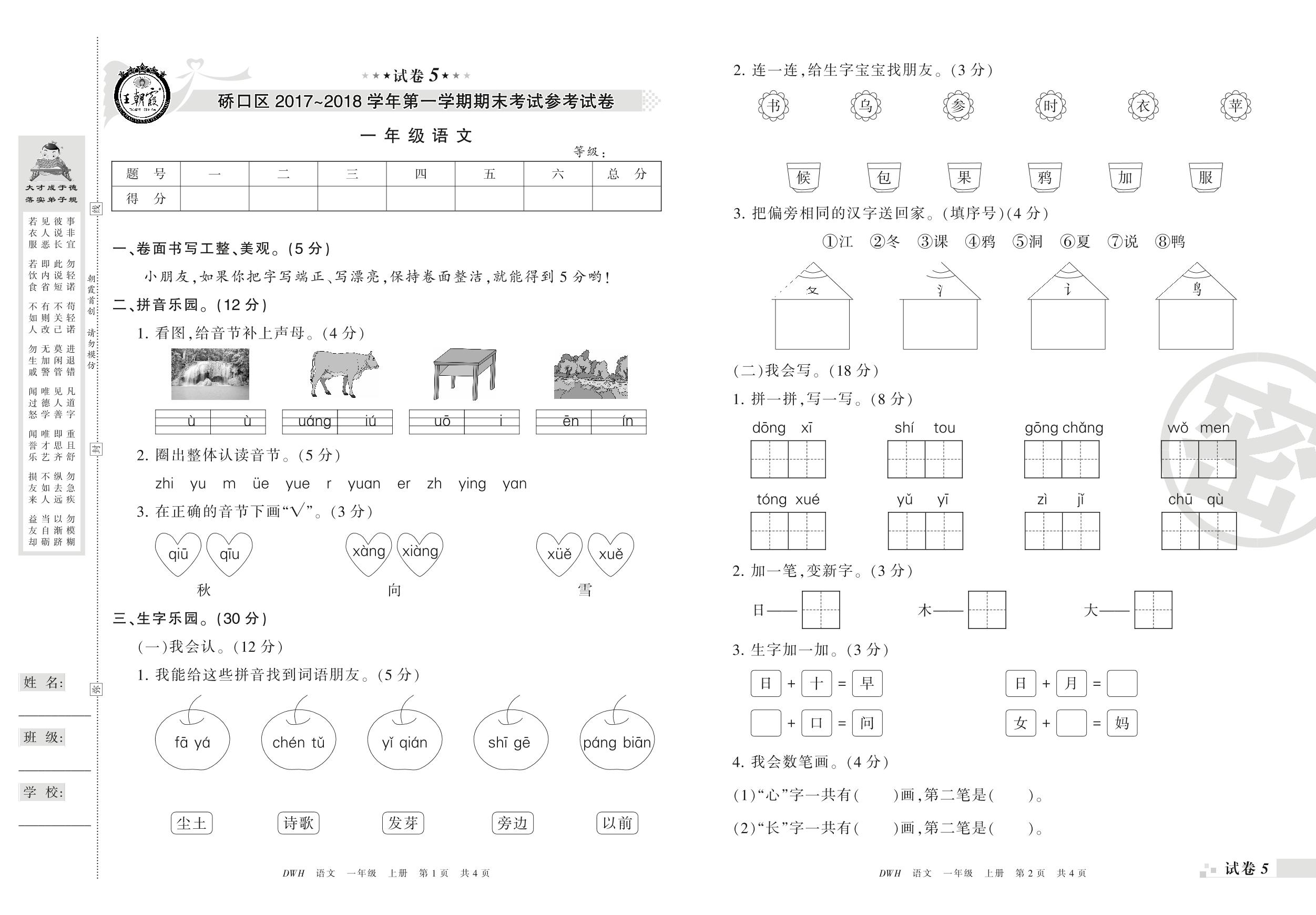 2017-2018学年第一学期武汉市硚口区一年级语文试卷(人教版)【5】