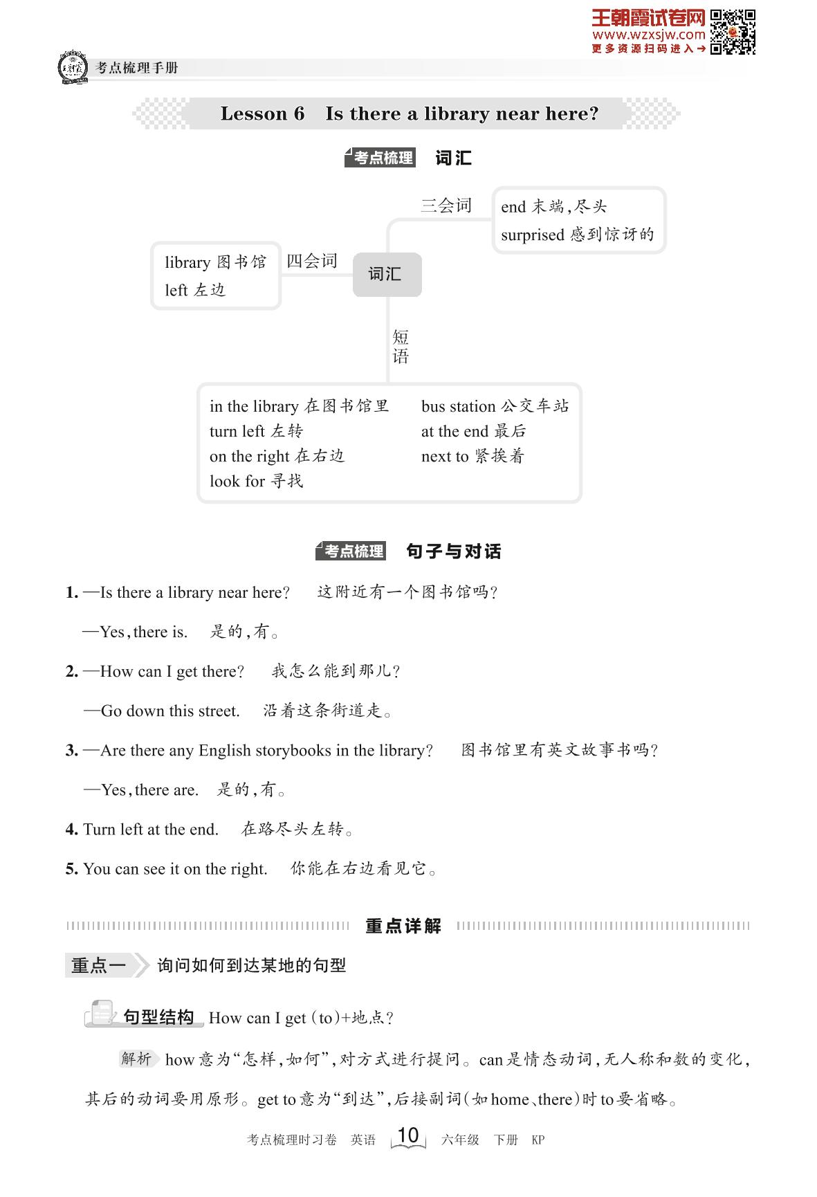 2023下册六年级英语科普版 考点梳理手册——Lesson 6 Is there a library near here