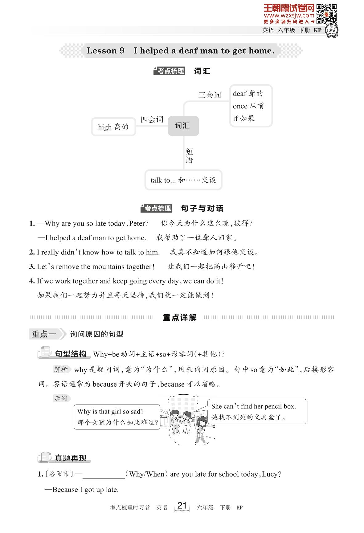 2023下册六年级英语科普版 考点梳理手册——Lesson 9 I helped a deaf man to get home.