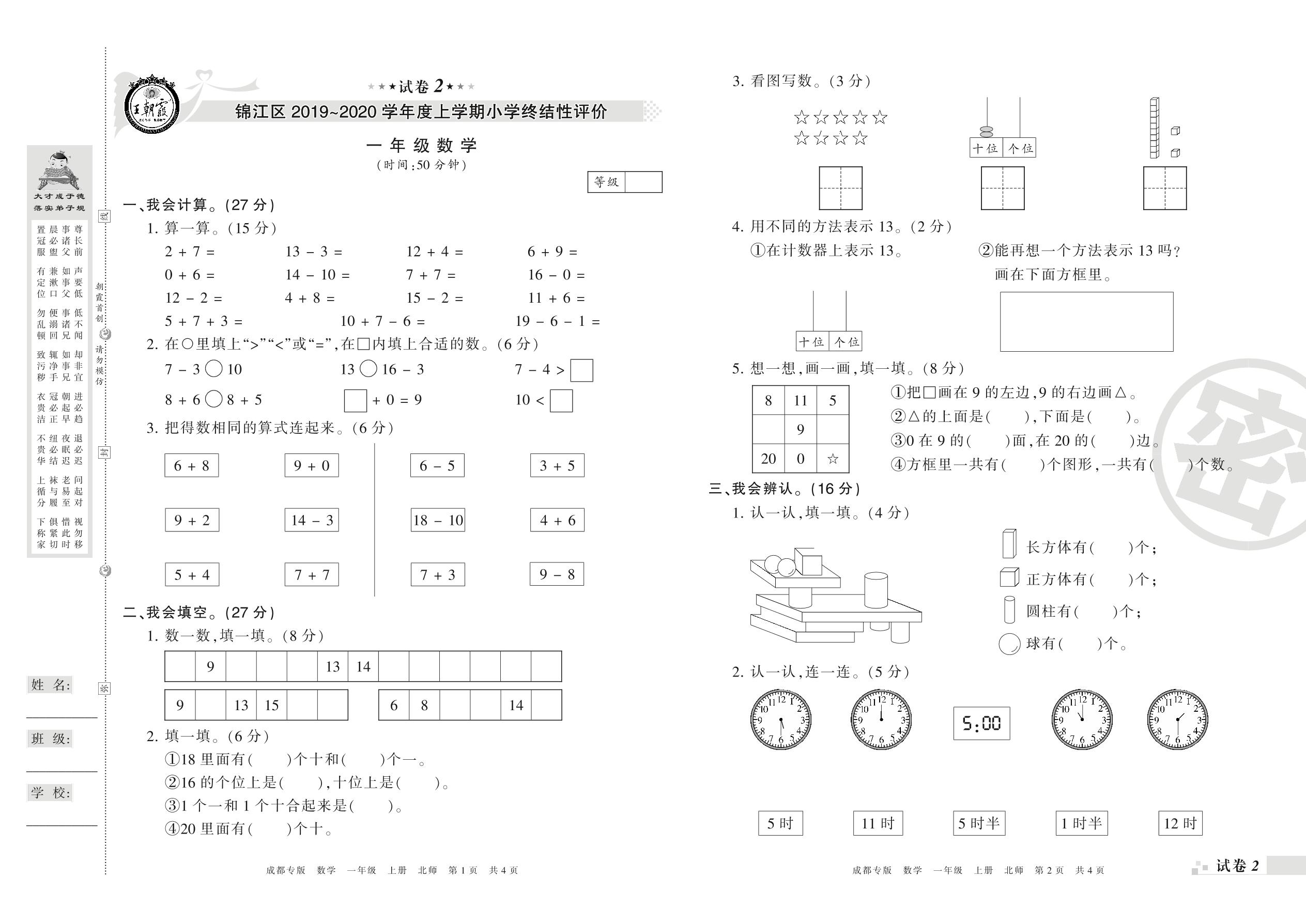 2019-2020学年第一学期成都市锦江区一年级数学试卷(北师版)【2】