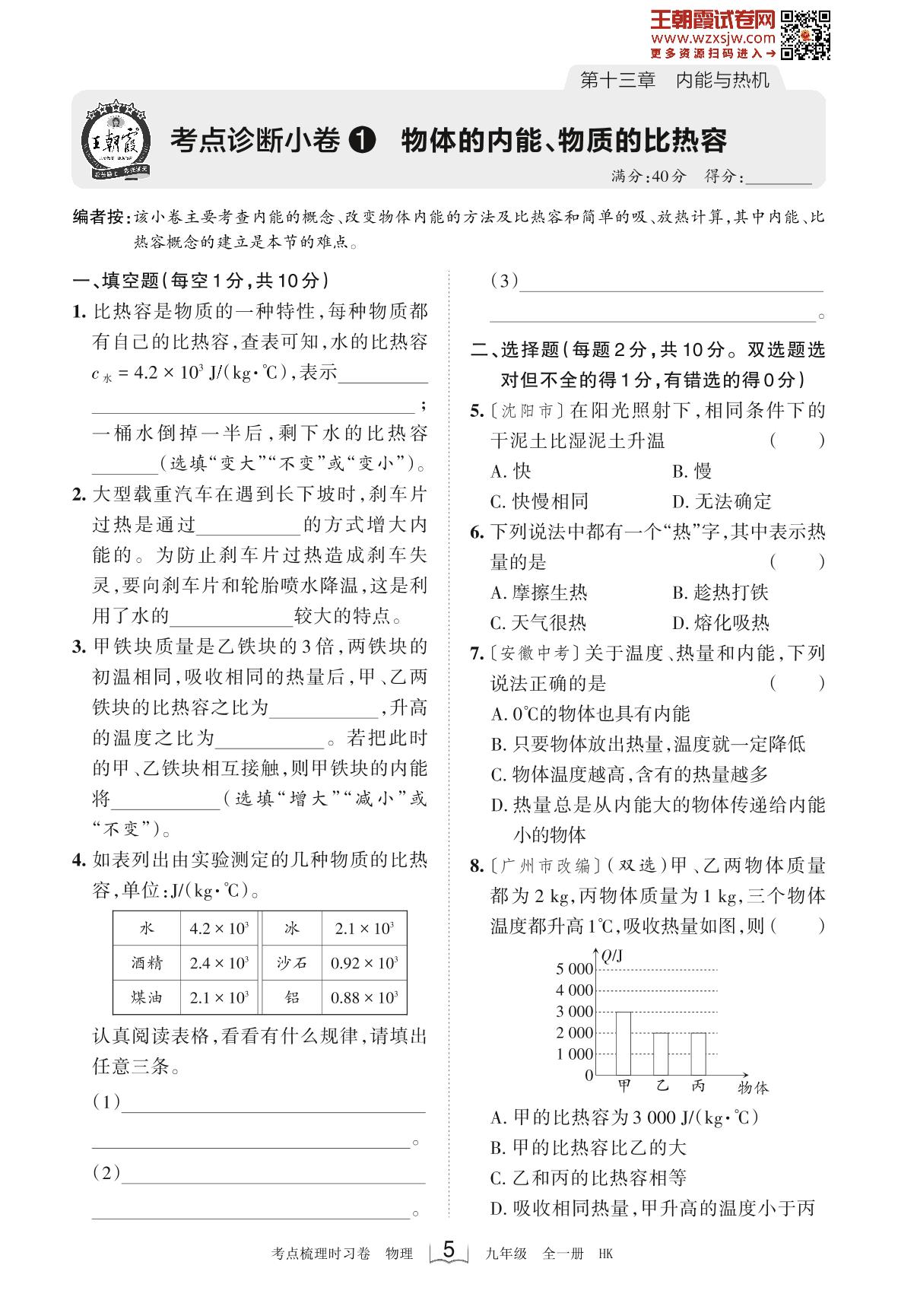 2023-2024学年九年级物理沪科版 第十三章 考点诊断小卷1 物体的内能、物质的比热容