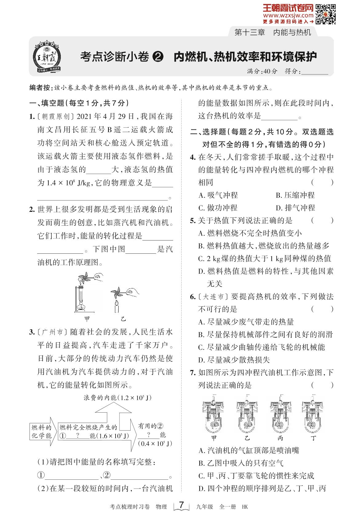2023-2024学年九年级物理沪科版 第十三章 考点诊断小卷2 内燃机、热机效率和环境保护