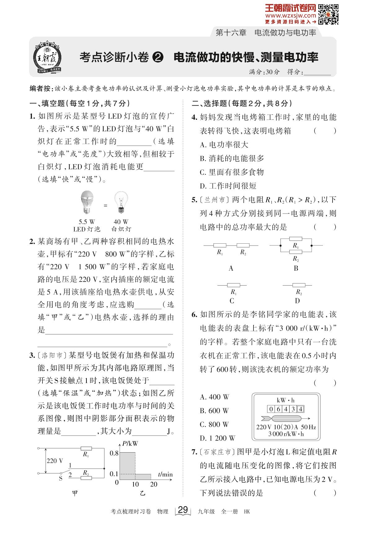 2023-2024学年九年级物理沪科版 第十六章 考点诊断小卷2 电流做功的快慢、测量电功率