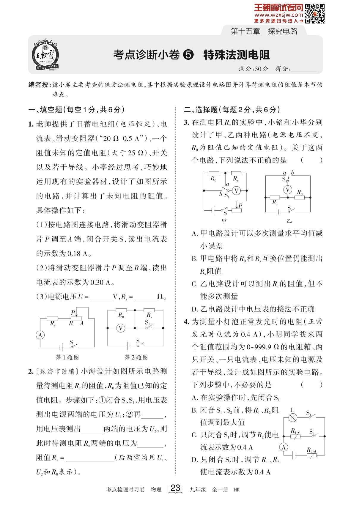 2023-2024学年九年级物理沪科版 第十五章 考点诊断小卷5 特殊法测电阻
